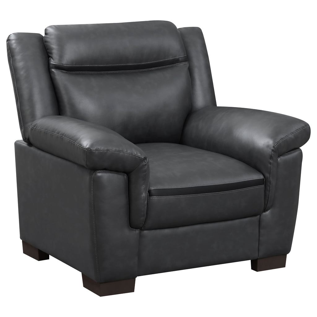 Bring modern comfort and sophistication to your seating area with this contemporary armchair. Upholstered in smooth grey leatherette with detailed stitching, it offers a clean, refined look. Generously padded seating and plush pillow-top arms provide exceptional comfort, while the high back delivers excellent support. Its sturdy wooden frame and dark brown block-style legs add lasting stability and a touch of contrast. Compact and stylish, this chair enhances any living room or lounge space with its modern design and inviting appeal._x005F_x000D_ Key Features: • Accent chair upholstered in soft grey leatherette with refined stitched detailing for a sleek finish • Plush cushioned seat and pillow-top arms create a cozy, supportive seating experience • High backrest offers exceptional comfort and ergonomic support for everyday lounging • Dark brown block-style legs provide sturdy stability and a modern contrasting accent • Durable wooden frame construction ensures long-lasting strength and reliability • Compact profile fits easily into living rooms, bedrooms, or office seating areas