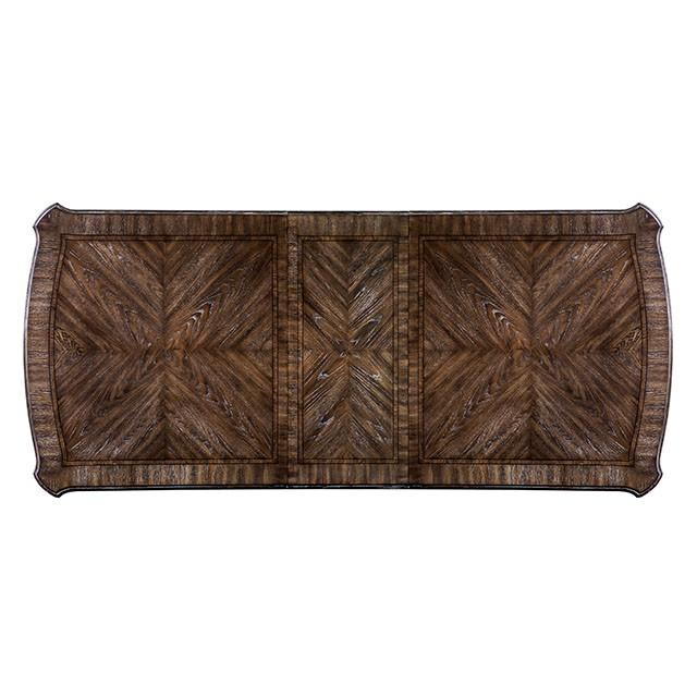 ARCADIA Rustic Natural Tone, Ivory Dining Table, 96"(78" + 1 X 18"Leaf) L X 44"W X 30 1/2"H, 204.8lbs. Beautiful wood inlay details and a dramatic double pedestal base create a grand statement with elegance galore. The ivory fabric upholstery provides a stunning contrast against the rustic natural tone finish for a look that is as cozy as it is chic. Intricate leg designs play beautifully off the delicately cut backs for a look that will inspire and amaze. Features: Transitional Style 18" Expandable Leaf Intricate Wood Inlay Details Double Pedestals Center Support Beam Padded Ivory Fabric Cushions Solid Wood, Wood Veneer, Others Rustic Natural Tone Finish