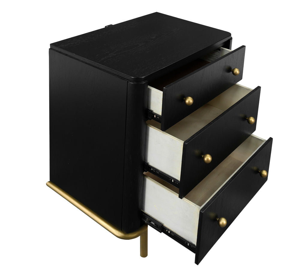 Retro charm meets modern function in this three-drawer nightstand, featuring a warm sand wash finish with subtle wire-brushed texture. Round aged brass knobs and matching tubular metal legs add a hint of glamour, while a built-in dual USB port offers convenient bedside charging. The top felt-lined drawer keeps delicate items safe, blending timeless mid-century aesthetics with everyday practicality for a refined and functional bedroom accent._x005F_x000D_ Key Features: • Three-drawer nightstand with soft sand wash wire-brushed finish • Aged brass knobs and metal legs enhance its mid-century appeal • Top drawer lined with felt to protect delicate items • Built-in dual USB ports for convenient bedside charging • Crafted from rubberwood, engineered wood, and ash veneer • Elegant rounded corners and tubular legs add modern balance