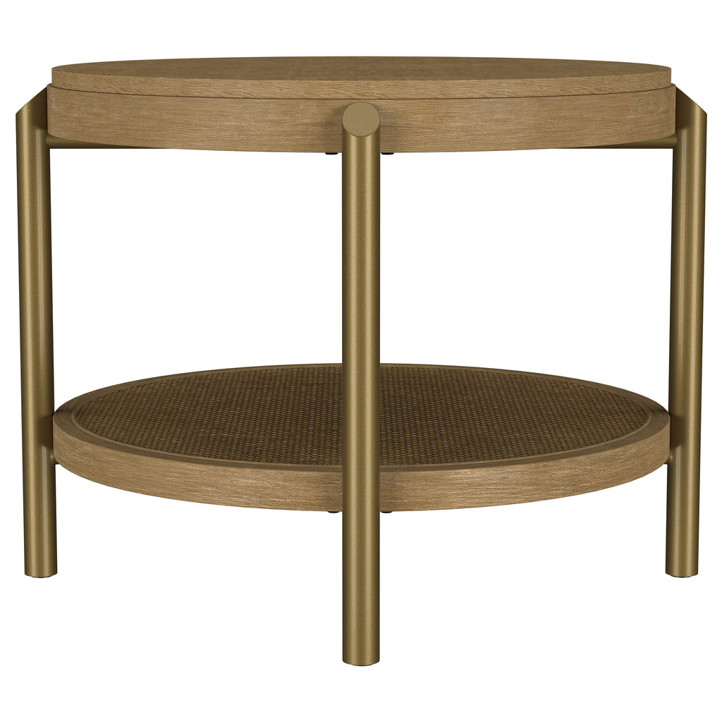 This round end table showcases a refined blend of natural and industrial elements, perfect for modern interiors. Crafted from Asian hardwood, engineered wood, and ash veneer, its finish highlights the table's organic grain for a subtle, rustic appeal. The lower shelf features natural woven rattan, offering functional storage with a stylish touch. Sturdy aged brass-finished metal legs provide contrast and durability. Ideal as a side table or accent piece, it combines elegance and utility effortlessly.
