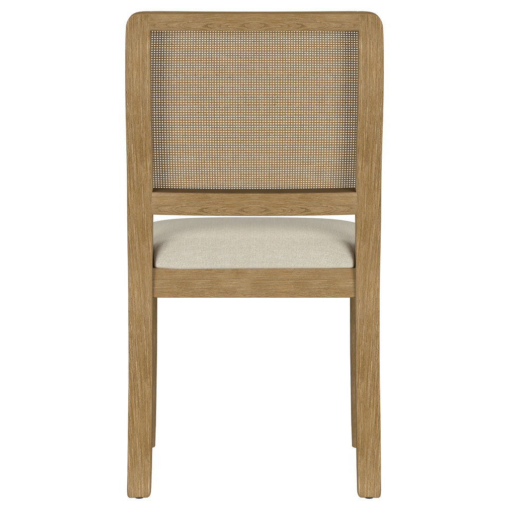 This dining chair combines modern comfort with organic charm, featuring a handwoven cane backrest crafted in Indonesia for a natural, textured appeal. The solid Asian hardwood frame provides durability and a warm aesthetic, while a beige linen-like upholstered cushion enhances its cozy style. Pirelli webbed seat construction ensures both comfort and lasting support. Reinforced with a sleek metal stretcher bar, this chair balances beauty and functionality.