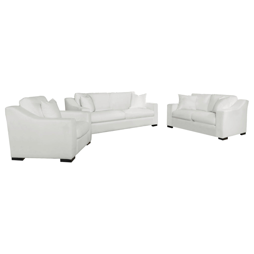 Elevate your transitional living room with this contemporary upholstered seating set, featuring a white trillium polyester blend fabric that covers elegant sloped track armrests as well as reversible box seat and back cushions with top stitching details. Block style legs in a handsome, bold cappuccino finish lend a striking contrast to the clean white upholstery. Matching accent pillows offer extra comfort and unify the seating pieces together.
