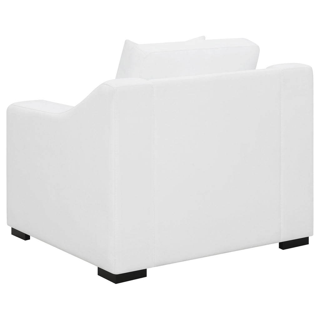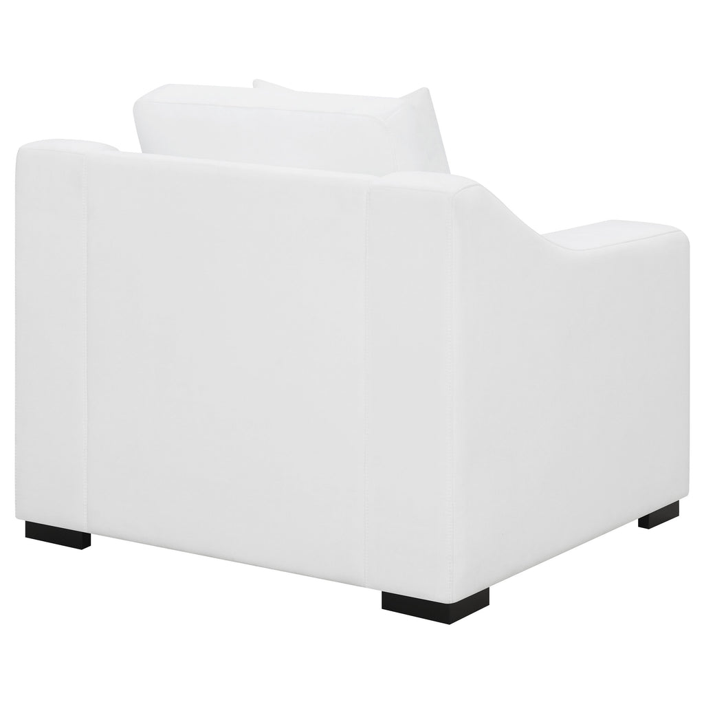 Create your favorite cozy reading nook with this transitional lounge chair, upholstered in a white trillium polyester blend fabric across elegant sloped track armrests and a tailored top-stitched reversible box seat and back cushion. A solid wood frame beneath offers long-lasting stability as bold and contrasting cappuccino finish block style legs peek out from the bottom and offer a slight elevation over decorative rugs and flooring. Key Features: • Soft sloped, wide track arms • Relax in trillium filled cushions that create a down-like seating comfort • Reversible seats and backs • Boxed seat and back cushions with top stitching for a tailored look • Wide solid wood legs in cappuccino complement the arm width