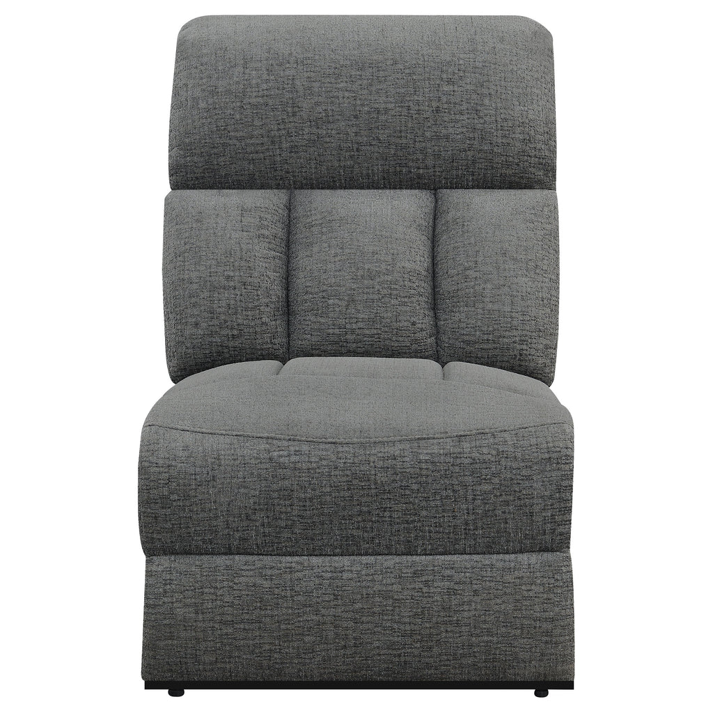 Design a living room built for comfort and relaxation around this transitional reclining sofa. Offering dual recliners operated with a side pull lever, the sofa encourages rest and rejuvenation in inviting style. Charcoal upholstery delivers a smooth, soft look and feel, while plush cushions are both supportive and comfortable for lounging. Pillowtop armrests are ideal for curling up on a cool evening or indulging in a quick afternoon nap. Tufting accents add support and structure to plush cushions while creating a dimensional look that works in your living room. Key Features: • Dual recliners operated with side pull lever for rest and relaxation • Charcoal upholstery for a smooth, soft look and feel • Plush cushions for supportive and comfortable lounging • Pillowtop armrests for curling up on a cool evening • Tufting accents for support and structure with a dimensional look