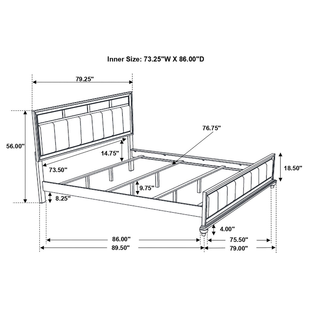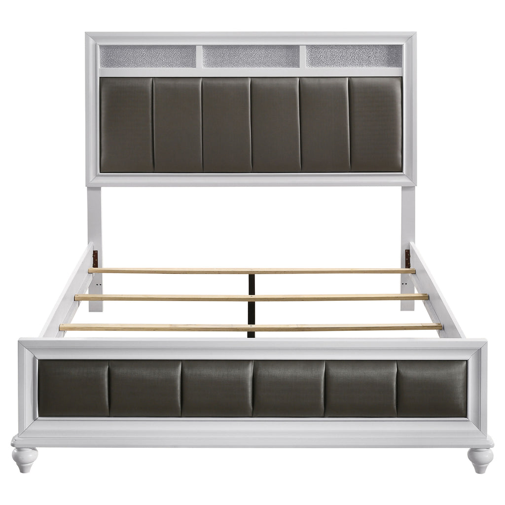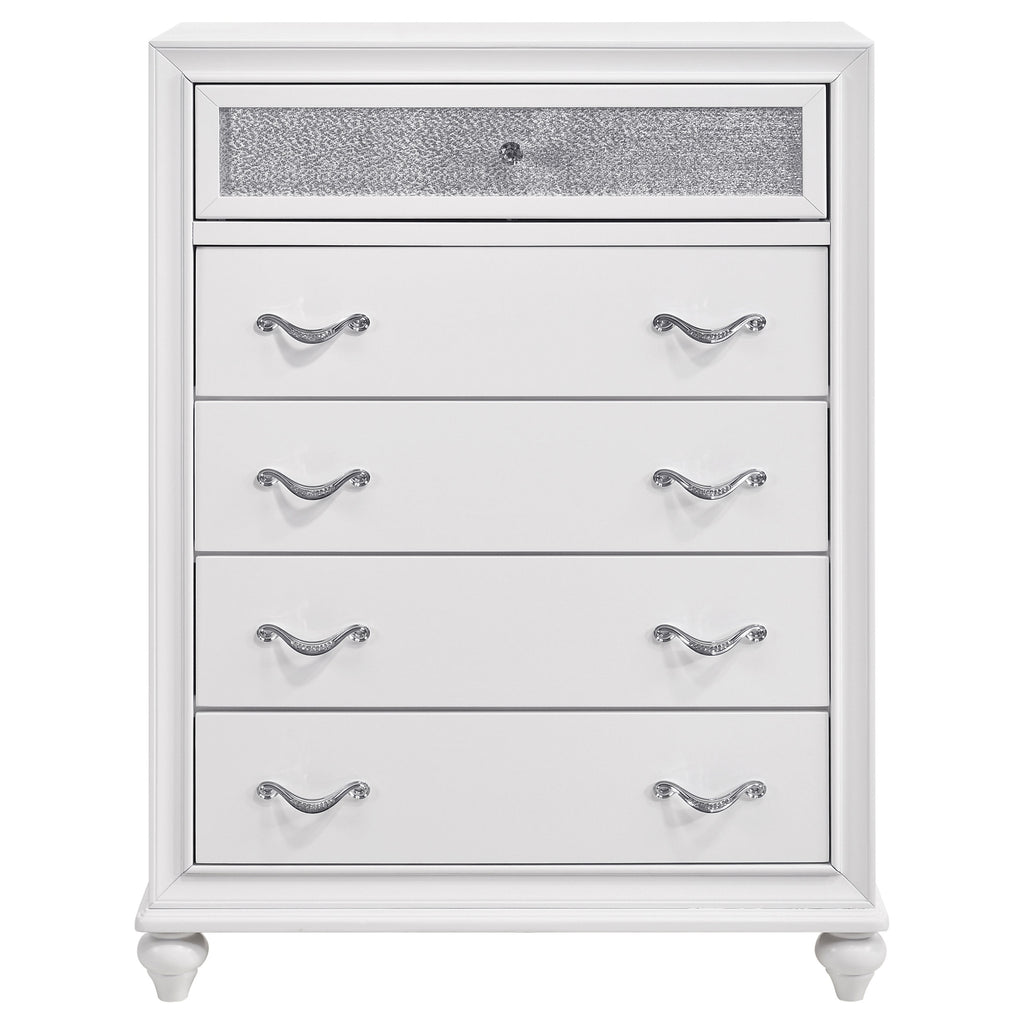 Transform your bedroom with the elegant design of this white set. The panel bed showcases metallic leatherette channel tufting framed by crisp molding and finished with turned feet for timeless charm. Coordinated storage brings added sparkle with glittery acrylic panels and faceted crystal hardware, blending modern radiance with classic details. Sculpted bun feet complete the look, while solid rubberwood, engineered wood, and okume veneer provide durability for lasting beauty and function._x005F_x000D_ Key Features: • Bedroom set in white finish combines timeless elegance with glamorous design • Panel bed features metallic leatherette channel tufting with molding details • Sparkling acrylic accents add radiance to the clean white storage surfaces • Crystal hardware enhances drawers with brilliant jewelry-like shine • Ample storage keeps clothing and essentials organized in style • Crafted with solid rubberwood, engineered wood, and okume veneer for quality