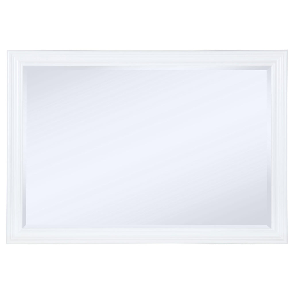Textured rattan drawer fronts create a fresh, modern coastal aesthetic for this contemporary bedroom set. Offering ample storage and a clean look and feel, the set centers on a wooden bed with a gently flared, upholstered headboard with plush foam padding for easy comfort. The set includes a bright white finish, offering easy contrast to the rattan and linen-colored fabric upholstery that creates cool ambiance. Top drawers in the set include black felt lining and drawers are dotted with round metal knobs. The dresser includes a framed mirror while the nightstand offers both a drawer and a shelf for easy storage and decor.