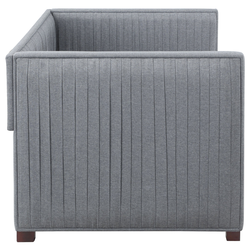 A gray fabric, pleated and overlapping along the surface of this twin daybed and trundle set, create a textured appearance against the clean straight lines. The narrow arms and backrest invite you to get creative with your own accent pillows and throws, opening this furniture piece up to becoming a lounge sofa or a bed for additional overnight guests. A trundle slips beneath the main frame when not in use or can be retrieved and glided out effortlessly. Black finish feet add slight elevation and a pop of contrast against flooring and rugs too. This twin daybed trundle set is the perfect addition for compact, multipurpose spaces like home offices and guestrooms. Key Features: • With its thin, pleated, fabric details, this shelter back daybed features exceptional tailoring throughout • Relax in comfort with this sleeping, lounging, daybed must-have • Perfect for smaller living areas, convenient pull out trundle for extra sleeping space when needed • Upholstered in grey fabric • Frame constructed with pine and MDF • Slat kits included