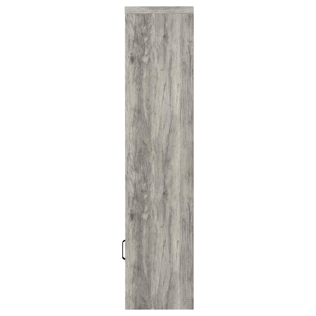 Tall and slender, this modern media tower is the perfect complement for your entertaining needs in both compact and larger spaces. Organize media, books, and implements on shelves and interior shelves, staying organized and uncluttered. Melamine construction features a distressed weathered gray finish with grain-like markings, offering rustic vibes. Find space on three fixed shelves and one adjustable shelf, all ready to separate and store gaming supplies, media, or books. A single black finished metal hardware pull offers an ideal match. Key Features: • Modern media tower suitable for various space sizes • Organize effortlessly with shelves and interior compartments • Distressed weathered gray finish for rustic charm • Three fixed and one adjustable shelf for versatile storage • Single black-finished metal hardware for a cohesive look