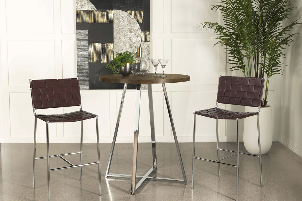 Host your closest friends around this contemporary bar table. Designed with a round, brown oak finished top, this sleek modern bar table invites you stand and converse around or pull up a coordinating rustic-inspired bar stool. Slim metal bars in a bright chrome finish make up the exposed pedestal base silhouette for a metallic accent in your space. Inspired by geometric angles and shapes, the legs join at the bottom, creating an X-shape motif. Place this modern rustic bar table in an entertainment area or home bar for a beautiful statement piece. Key Features: • A round table top is perfect for floating in a room • The brown oak finished paper veneer top maintains an organic touch of nature • The flared geometric metal base presents an open, airy silhouette • A gleaming chrome finish brings a cool tone metallic accent • Perfect for standing around or pulling up your own bar stools