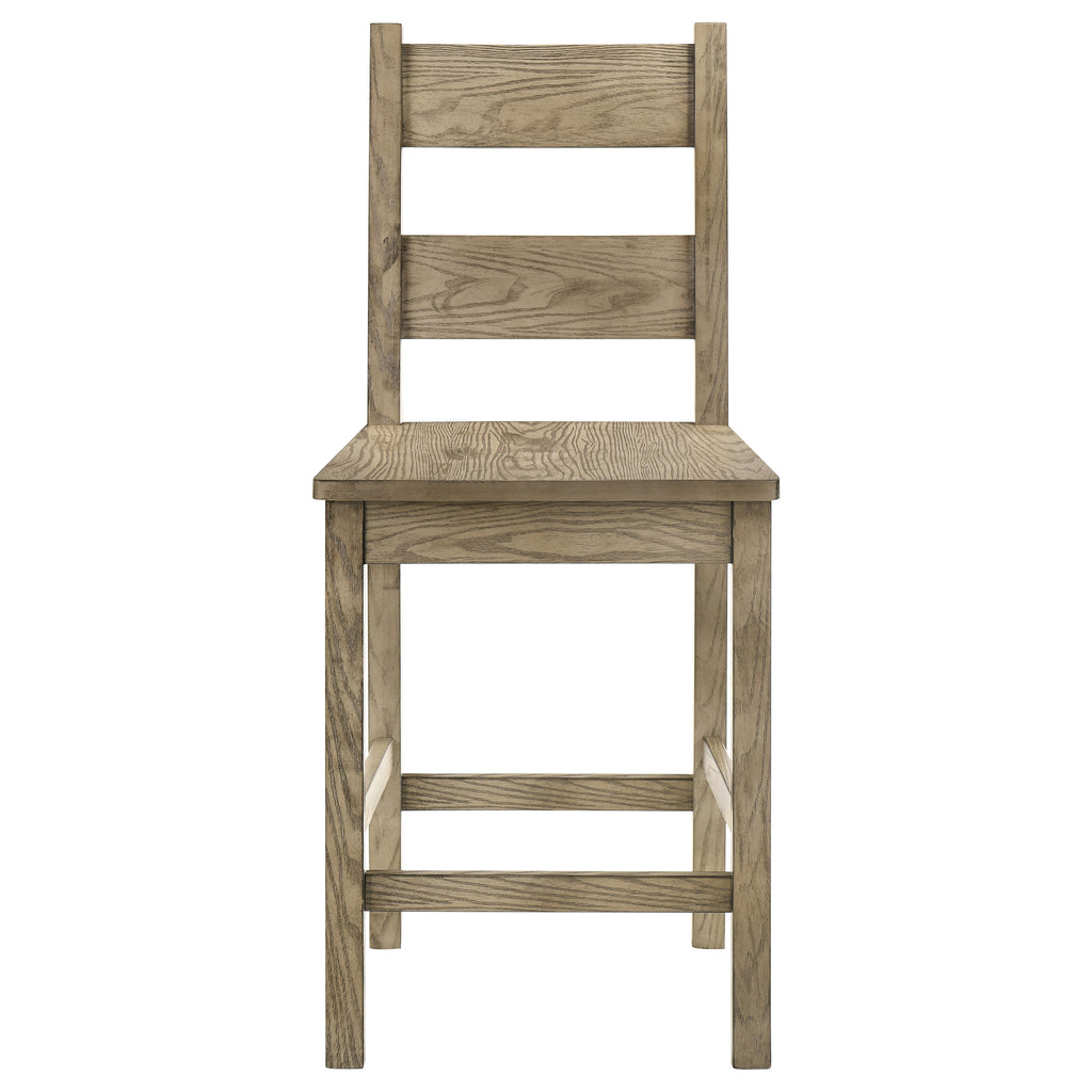 Blending rustic soul with intimate scale, this five-piece counter height set turns every meal into a gathering. A square table anchors the group with bold legs and vineyard oak grain, while four ladder-back chairs cradle comfort with their sculpted wood seats. Built from solid rubberwood, its raised format creates a welcoming rhythm for everyday dining in smaller spaces filled with warmth and connection. Key Features: • Five-piece dining set with square table and four matching rustic chairs • Vineyard oak finish draws out wood grain for added warmth and character • Counter height design encourages casual dining and comfortable posture • Chairs feature tall ladder backs and contoured wooden seating • Built from solid rubberwood for durability and lasting use • Ideal for smaller dining spaces, kitchen corners, or compact layouts