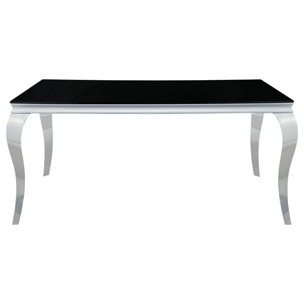 Craft the ultimate luxurious dining experience with this five-piece dining set. The rectangular table features a thick black tempered glass top. Radiant metallic and mirrored legs are full of sweeping and sinuous curves that dazzle. Elegant and eye-catching, this table highlights dinner spreads with decadence. The four included side chairs are comfortable with plush upholstery and high rolled backs.