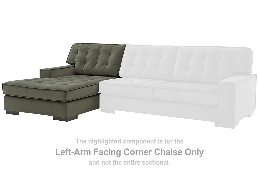This sleek sectional with chaise offers a highly contemporary look with plenty of space to spread out. Dramatic tufted detailing and luxurious upholstery in a rich olive color create a sophisticated atmosphere. This sectional is perfect for those who love to entertain, or simply relax, in uptown style and comfort.