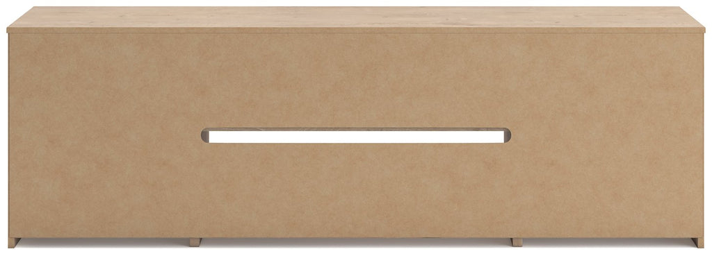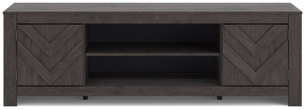 This TV stand with electric fireplace embraces a classically charming aesthetic and repurposes it for modern living. Its dark charcoal finish appeals to your love of vintage character, while a chic chevron pattern is effortlessly on trend. Media accessories stay tucked away in style thanks to hidden storage behind the doors. And for added ambiance, the electric fireplace brings a cozy-cool vibe to your living room. With the touch of a button, activate the LED-lit flame and adjust the temperature or the flame brightness. The flame effect includes multiple color options and a realistic-looking faux birch log set.