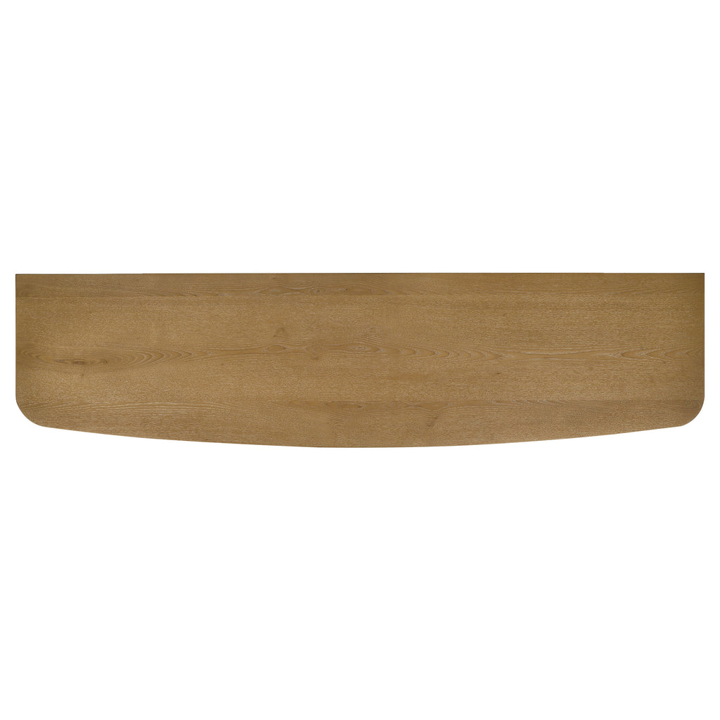 With graceful curves and rich texture, this mid-century inspired media console becomes an understated centerpiece. Reeded sliding doors ripple gently across the front, adding quiet rhythm to its softened silhouette. The weathered natural finish warms the room like sunlight through wood grain, while open shelving within offers thoughtful space for your favorite pieces. Crafted from solid rubberwood and engineered wood, and perched on tapered legs, it brings both elegance and ease to any curated living space. Key Features: • TV stand media console holds televisions up to 75 inches with stable, spacious top • Reeded sliding doors provide textural movement and conceal open shelving • Softly curved front and rounded corners offer a sculptural, mid-century profile • Interior shelves store media components, décor, or entertainment accessories • Back panel includes cord management cutouts for a clean, organized setup • Crafted from solid rubberwood and engineered wood in a weathered natural finish