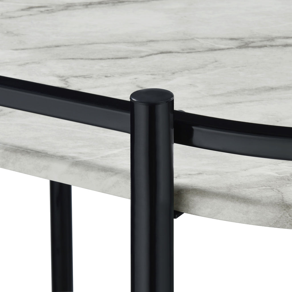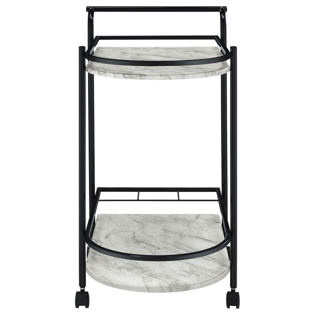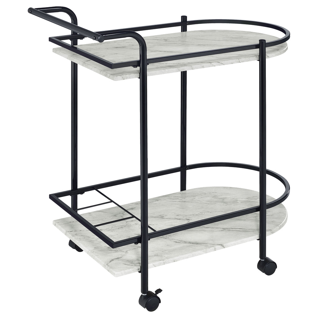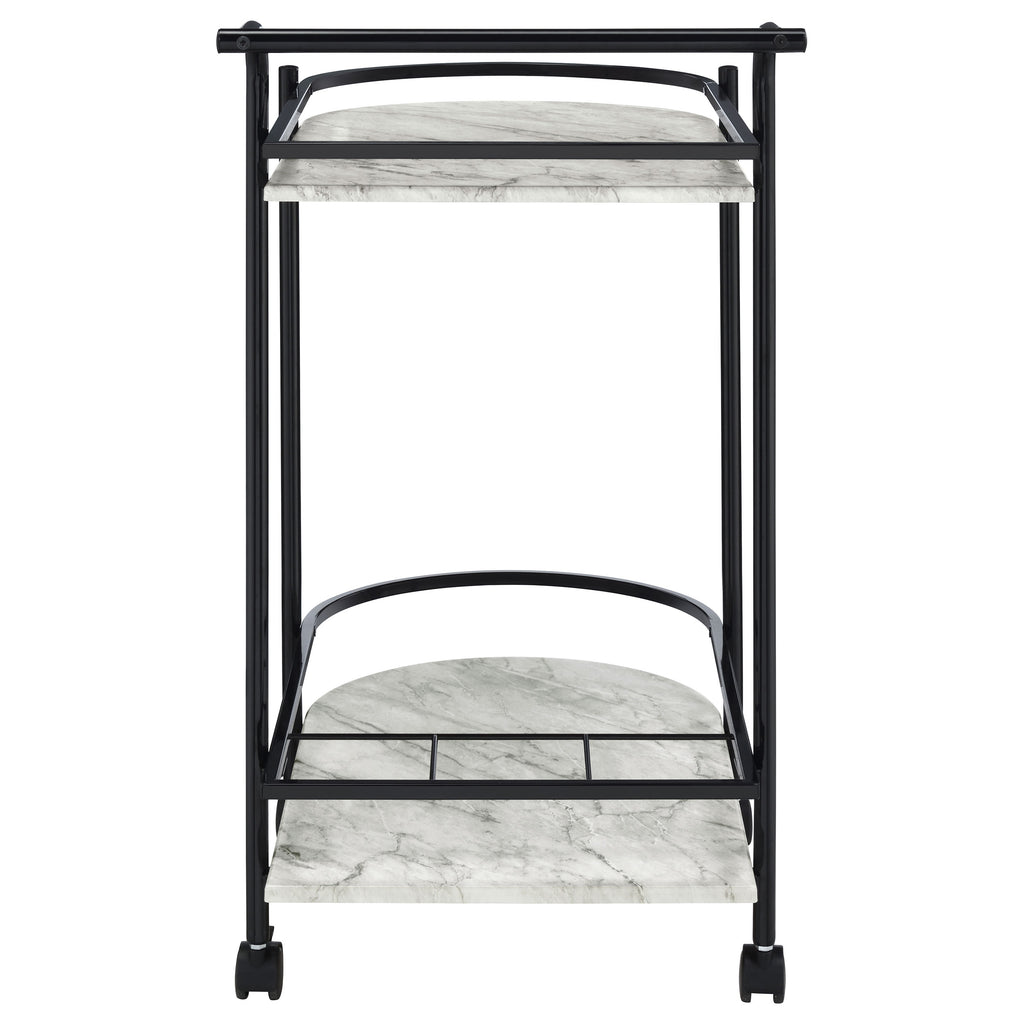 Invite guests over for an intimate soiree and serve up cocktails on this contemporary bar cart. Classic faux white marble shelves stack on top of one another, lending a traditional approach to its sleek modern silhouette. Rounded edges on one side add to the graceful appeal of the elongated shape. Designed in a metal frame with slim railing all around to keep bottles in place, this bar cart is ready to glide across floors. Lockable rolling casters secure it in place. Key Features: • Perfect for contemporary dining spaces and entertaining guests • Faux white marble shelves with rounded edges lend a traditional vibe • A metal frame with a handlebar along one side makes it easy to push around • Smoothly glide this cart from room to room with the lockable caster wheels • Secure 3 bottles on the built-in wine rack on the bottom shelf