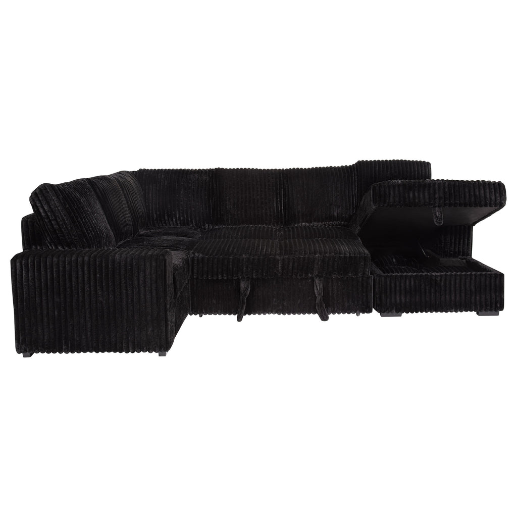 This versatile corduroy sleeper sectional effortlessly converts from cozy seating to a comfortable guest bed with its pop-up sleep surface. A spacious storage chaise keeps essentials at hand, while plush upholstery and three matching pillows provide lasting comfort and style. Its neutral tone complements any décor, making this piece an ideal centerpiece for relaxation, entertainment, and accommodating overnight guests. Built for durability, it seamlessly blends form, function, and modern appeal. Key Features: • Versatile sleeper sectional adapts from seating to sleeping • Soft camel corduroy upholstery complements any interior style • Quick pop-up bed provides instant accommodations for guests • Hidden storage chaise keeps essentials organized and out of sight • Sturdy hardwood frame with sinuous springs and pocket coils for support • Attached seat, reversible back cushions, and matching pillows for comfort