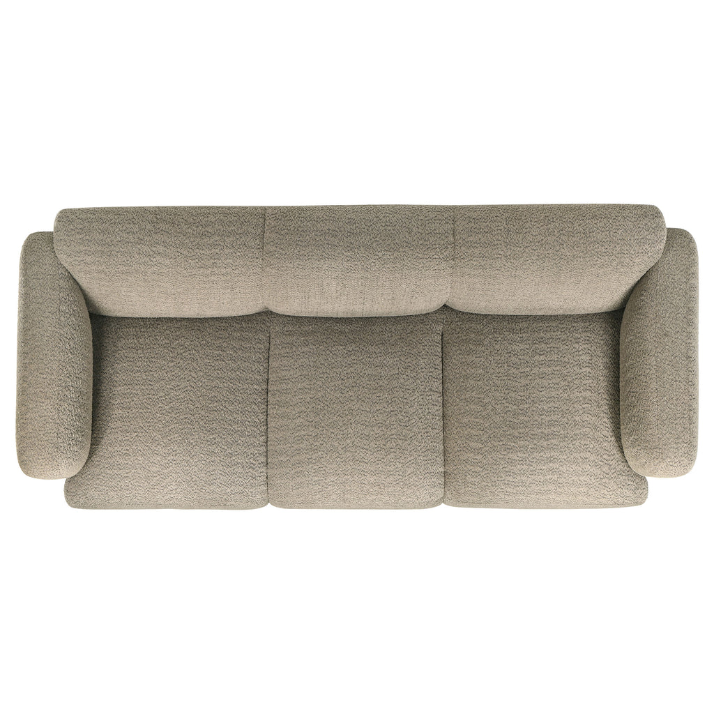 This sculptural sofa blends soft form with enduring comfort for a modern, relaxed atmosphere. Upholstered in a richly textured fabric with a cozy hand, its rounded profile flows seamlessly from the low back to wide, curved track arms. Built with high-quality foam and supportive pocket coil seating, it invites you to sink in and stay awhile. Fully finished and designed for everyday ease, this three-seat sofa anchors the living space with plush, minimalist style. Key Features: • Three-seat sofa with rounded silhouette and low-profile design for sculptural modern style • Upholstered in textured white fabric with a warm, soft hand and dimensional weave • Curved track arms and backrest create a continuous, enveloping frame • High-quality foam padding delivers plush comfort across the entire seat • Pocket coil seating offers long-lasting support and shape retention • Ideal for modern living rooms seeking both softness and subtle sophistication