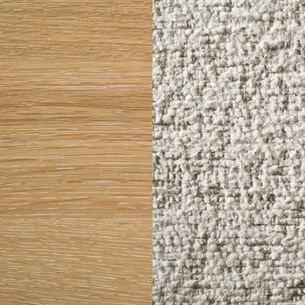 This rustic-meets-modern dining set offers a fresh take on everyday gathering. The rectangular table features a washed oak finish with a white oak veneered center and solid wood edge framing, all grounded by a trestle base with rounded posts for timeless appeal. Ladder back chairs mirror the table’s warmth with softly rounded corners and cozy oatmeal bouclé upholstered seats. Built from solid rubberwood and engineered wood, this well-crafted set delivers durability and style fit for family life. Key Features: • Dining set with washed oak trestle table and ladder back chairs in a modern rustic style • Tabletop features knotty oak veneer center panel with solid wood edge framing • Trestle base includes thick rounded posts for sturdy support and sculptural detail • Chairs include soft padded seats upholstered in oatmeal-colored bouclé fabric • Crafted from solid rubberwood, engineered wood, and knotty oak veneer for lasting use • Built to handle daily family meals with clean lines, soft textures, and enduring quality