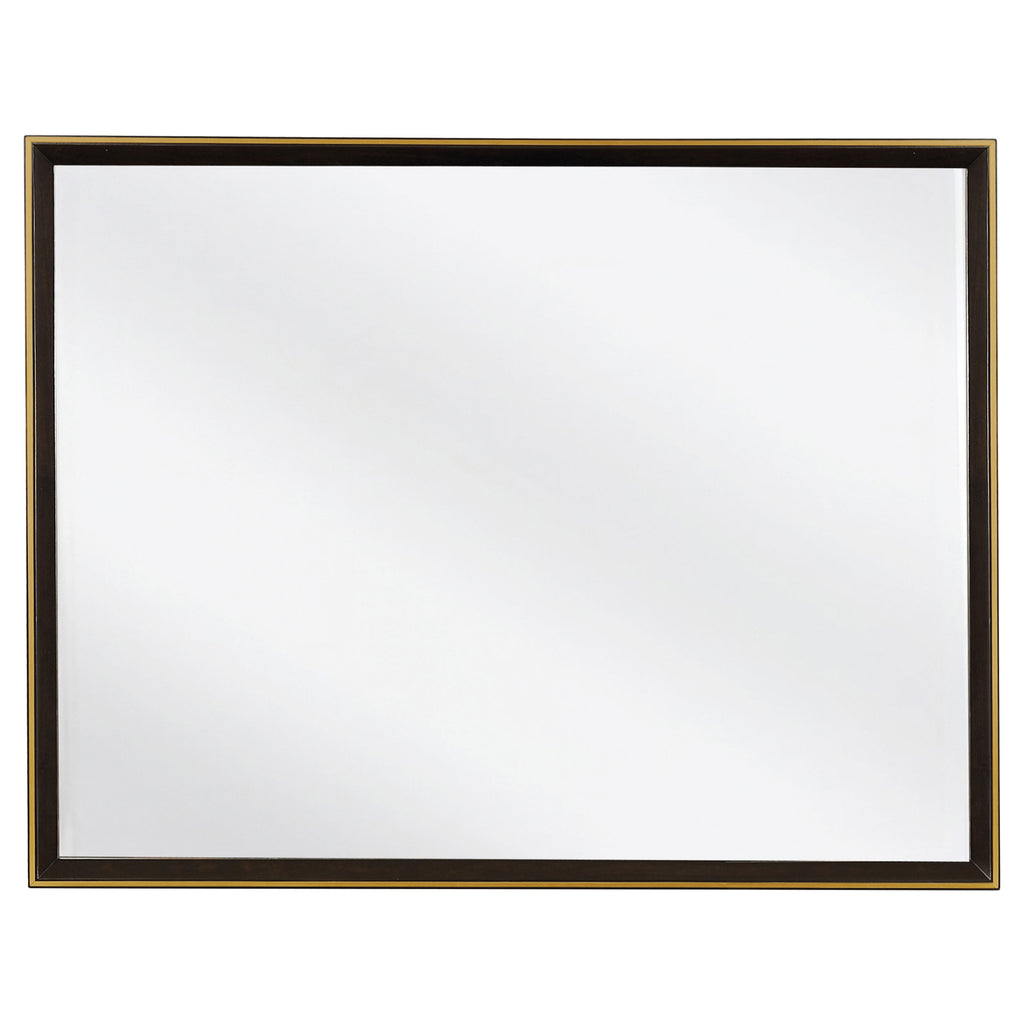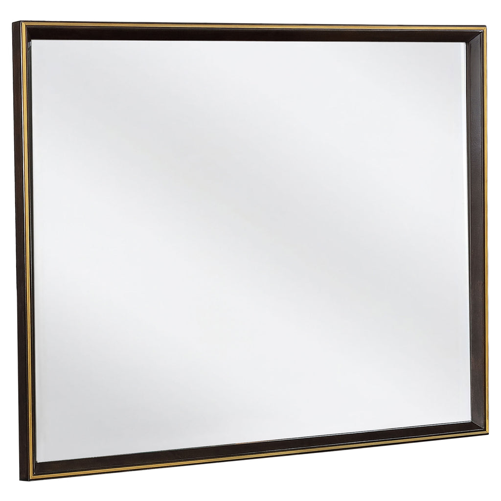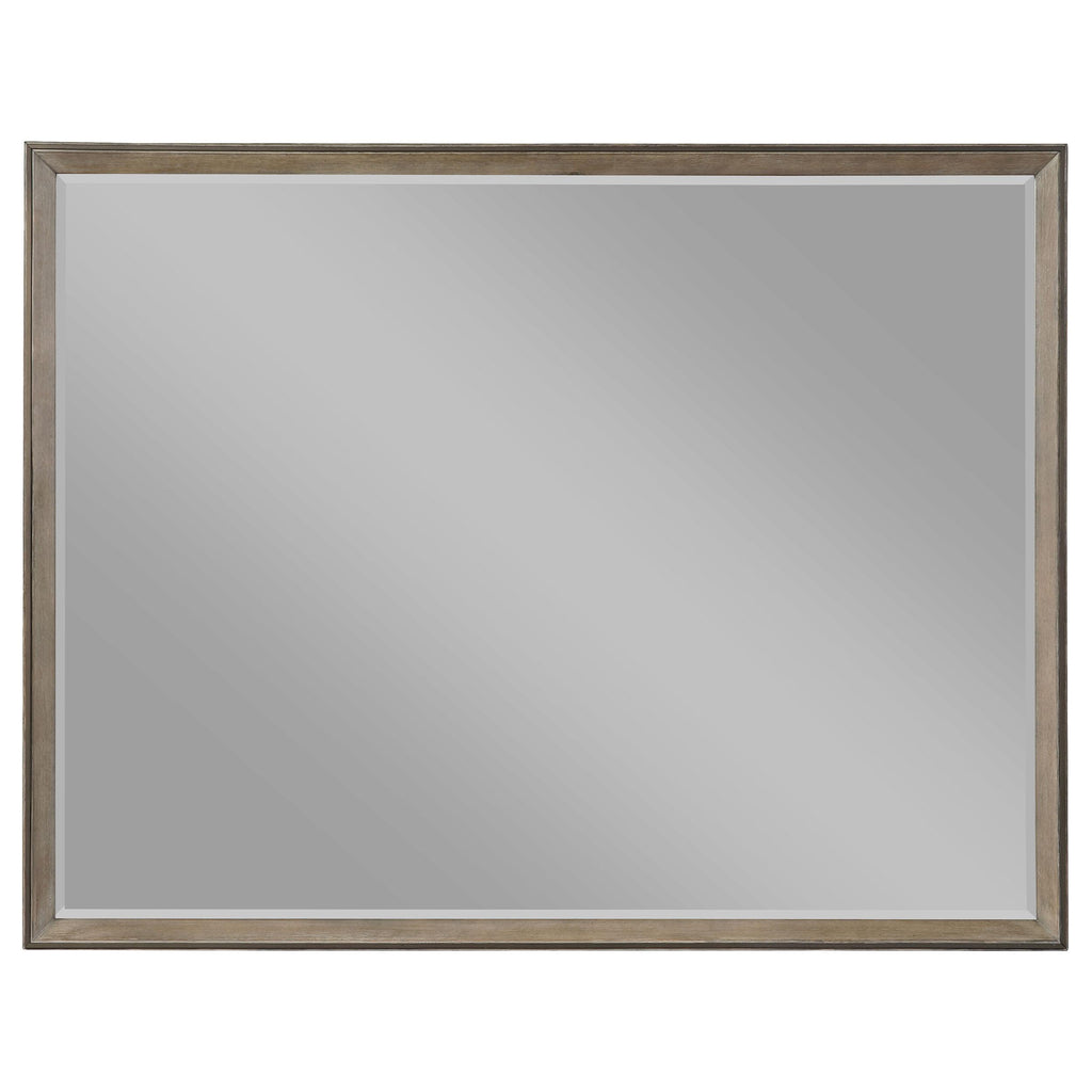 Geometric details from this queen four-piece bedroom set provide an interesting visual. Full of depth and warmth, the high upholstered headboard features a smoked peppercorn finish. This set is complete with a nine-drawer dresser and two-dresser nightstand and included shelf. Retro inspired details welcome structure and personality to any motif. Perfect above the dresser, the included mirror is clean and elongated. Key Features: • Bedroom set with panel bed, coordinated storage, and upholstered details • Smoked peppercorn wood finish delivers rich, modern tone • Bed features velvet-upholstered panels with grid tufting • Streamlined design blends modern styling with tailored accents • Crafted from poplar, birch veneer, engineered wood, and plywood • Gold-finish hardware adds contrast to dark wood and fabric surfaces
