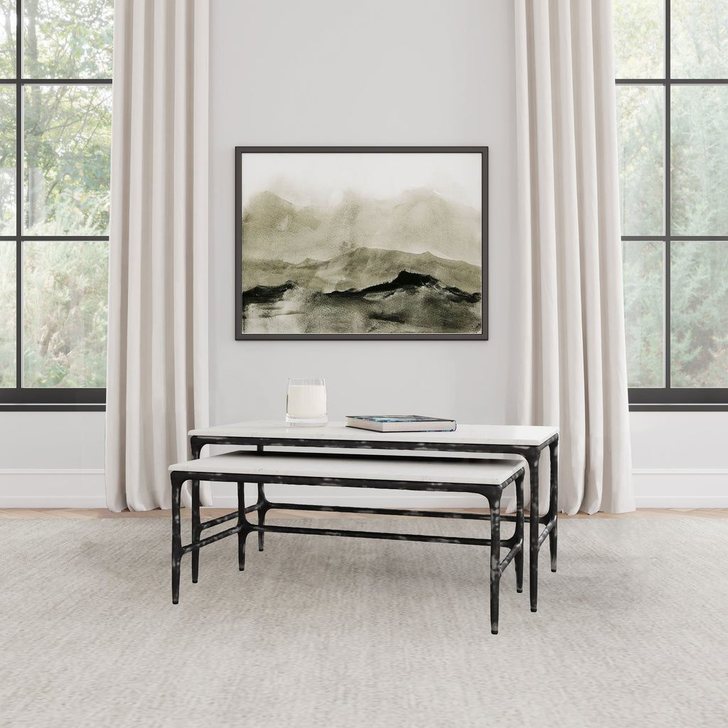 This two-piece nesting set introduces a refined center table solution. Arrange them as a cocktail table ensemble, or separate them to function as a versatile accent table. Each low table includes a genuine marble surface and an antique black iron frame, reflecting timeless sophistication. Their flexible design suits a coffee table configuration, easily adapting to changing needs.