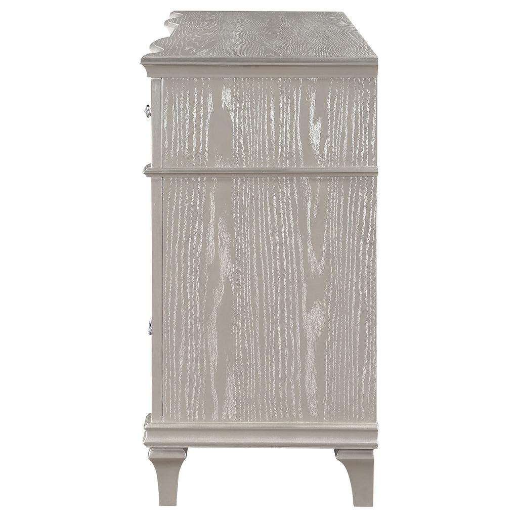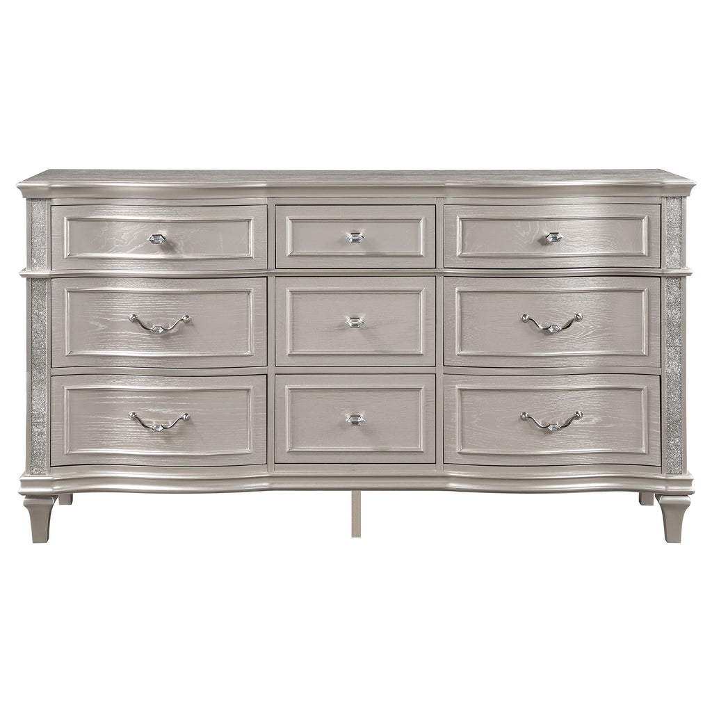 A silver oak finish creates an elegant touch to this glam nine-drawer dresser. Hexagon-shaped knobs and drop bail handles appointed with pearl accents adorn each of the nine spacious drawers for a luxurious look and feel. Keep delicate essentials organized within the grey felt-lined top drawers and garments in the deep bottom drawers. Across the dresser front is a curved facade that sweeps through the drawer fronts and ends at two sparkling column panels. Charming wood molding details along the top and bottom, along with intricate trim, offer a classical flair.