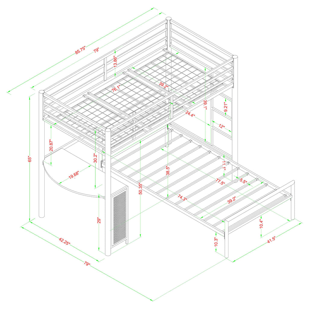 Every school-age child is over the moon to have a workstation loft bed in their room. The sleek gunmetal finish makes us an easy addition to contemporary sleeping spaces. The bottom area of the loft workstation serves as a study space, equipped with a shelf to hold a laptop and books. Your child can easily access the top bunk by using the secure attached ladder. It's easy to snooze soundly on the top bunk, which is safely constructed with guardrails for your peace of mind. A separate full size bed underneath the loft allows for convenient sleep space for siblings or guests. Set includes 460229 twin loft bed and 300279F full bed.
