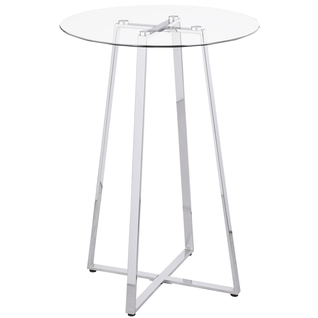 Whether you're sitting down to an intimate dinner or enjoying a cocktail with friends, this contemporary bar table helps you entertain in style. Its compact size allows for a variety of placement options, making it ideal for a small kitchen or dining area. An attractive yet simple design blends seamlessly with any home decor. Smooth, clean, tapered lines and a gleaming chrome finish give it a pleasingly modern appearance. A round, clear, tempered glass top completes its elegant look Key Features: • Round bistro bar table with a clear tempered glass top and chrome legs • Electroplated chrome base offers a polished look and lasting durability • Geometric leg frame provides stability and a minimalist silhouette • Compact 30-inch diameter is ideal for small kitchens or dining nooks • Pairs easily with modern bar stools for casual or upscale dining • Made with clear glass and heavy gauge metal in a modern profile