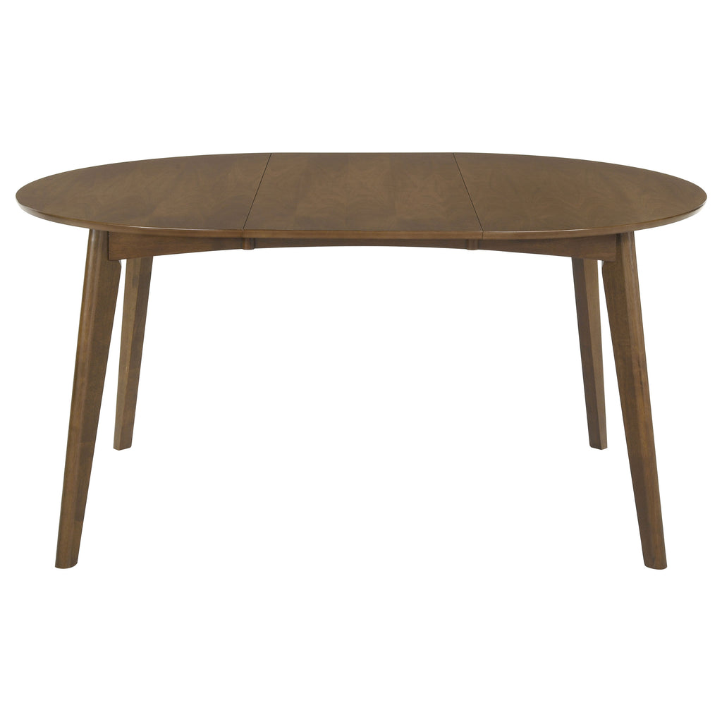 The Malone Collection includes this extendable modern dining table. Solid wood construction and angled legs allow for durability against daily use. Removable leaf extends for an oval shape that welcomes a close-knit gathering. Finished in dark walnut for a condo in the city or a log cabin in the mountains. Pull up a chair with cushioned seating and enjoy a home-cooked meal. Key Features: • Oval dining table with smooth rounded edges and a mid-century modern silhouette • Dark walnut finish enhances the warm wood tones of the tabletop and legs • Removable leaf transforms the table from compact to extended oval shape • Angled legs add a retro-inspired design detail with everyday functionality • Constructed from solid rubberwood, engineered wood, and walnut veneer • Assembly required with clean profile ideal for both small and open dining spaces
