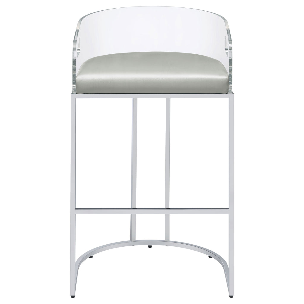 Ultra-modern with a retro-inspired vibe, this pair of stools make a striking piece to a dining room space. With a curved backrest in a clear acrylic material, each stool offers an open and airy design. Rest comfortably on a leatherette cushion as you dine or sip a cocktail. In addition, each stool is supported by a slim metal legs in a lustrous chrome finish and a base shape that mimics the rounded acrylic backrest. Pull up a pair of these stools to a kitchen bar or complete a compact home bar. Key Features: • Ultra-modern with a retro-inspired vibe, these stools feature a curved backrest in clear acrylic and leatherette cushion for comfort • Slim metal legs in a lustrous chrome finish and a base shape that mimics the rounded acrylic backrest provide support • Ideal for a dining room, kitchen bar, or home bar • Open and airy design offers an airy feel • Lustrous chrome finish adds a touch of glamour