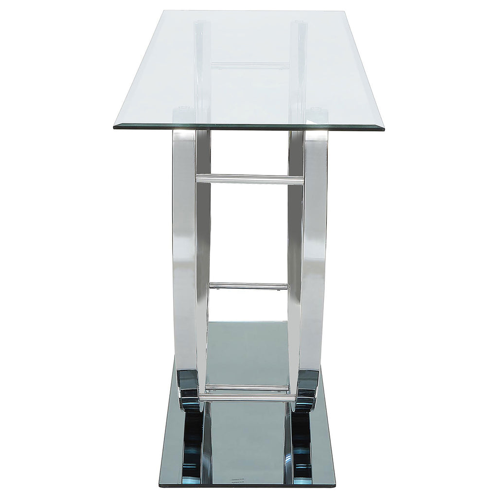 This modern rectangular console table showcases a clear tempered glass top paired with a sleek mirrored base, creating a polished, contemporary appeal. The curved frame, crafted from heavy gauge electroplated chrome metal, adds a touch of sophistication and elegance. Built with durable materials, this console table is perfect for entryways, hallways, or behind sofas, offering a striking, functional piece that enhances any modern space while ensuring lasting quality. Key Features: • Rectangular console table with a clear, durable tempered glass top • Reflective mirrored base adds a sophisticated, modern visual element • Heavy gauge metal frame with electroplated chrome finish for durability • Stylish curved design enhances the aesthetic of contemporary interiors • High-quality materials ensure strength and long-lasting use • Perfect for entryways, hallways, or behind sofas with modern appeal