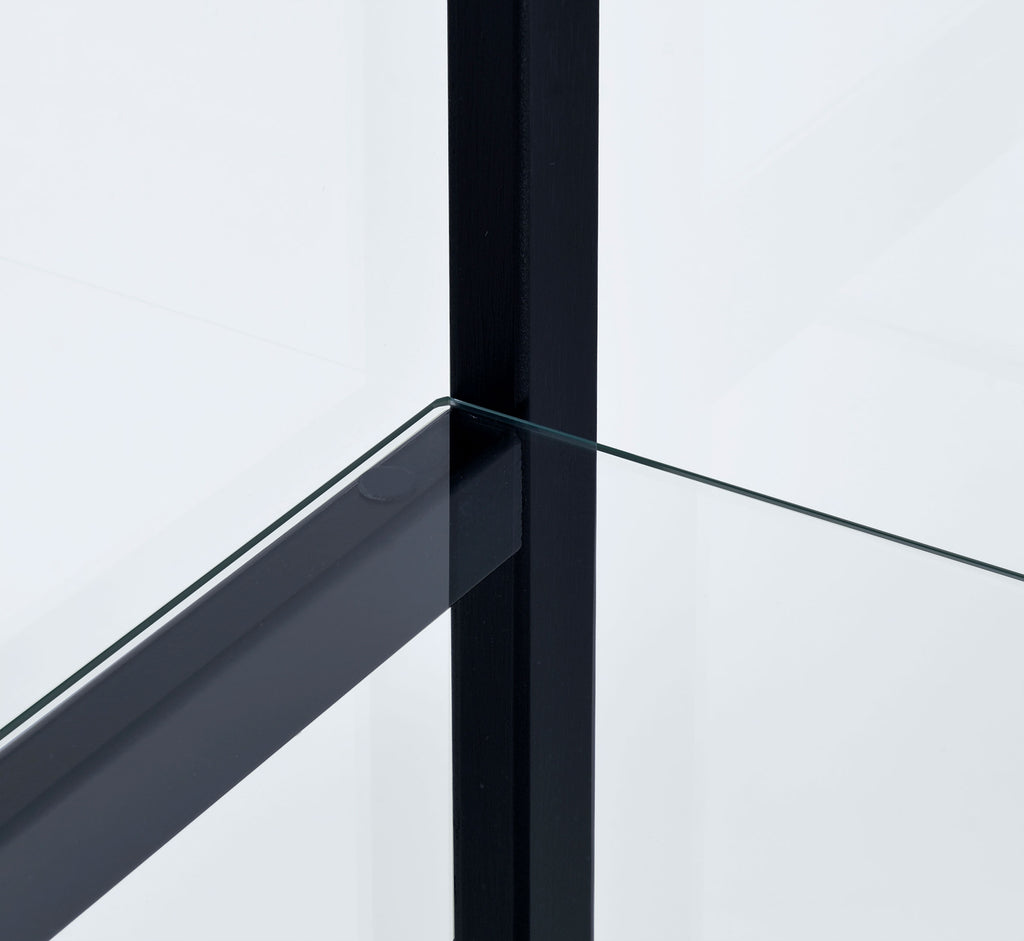 A modern version of a true classic makes a fabulous addition to a transitional space. With linear styling and a fresh look, this curio cabinet offers a perfect venue for showcasing treasured decor. Bold black tops a simple frame, top, and base. Tempered glass shelves create transparent space for display. Access its interior easily with push-to-open doors. Key Features: • Modern curio cabinet in black finish • One reversible magnetic push-to-open clear tempered glass door provides ease of access and strength • Three tiers of shelving for additional display space • Available in a variety of sizes • Glass, pine, particle board, and laminate construction