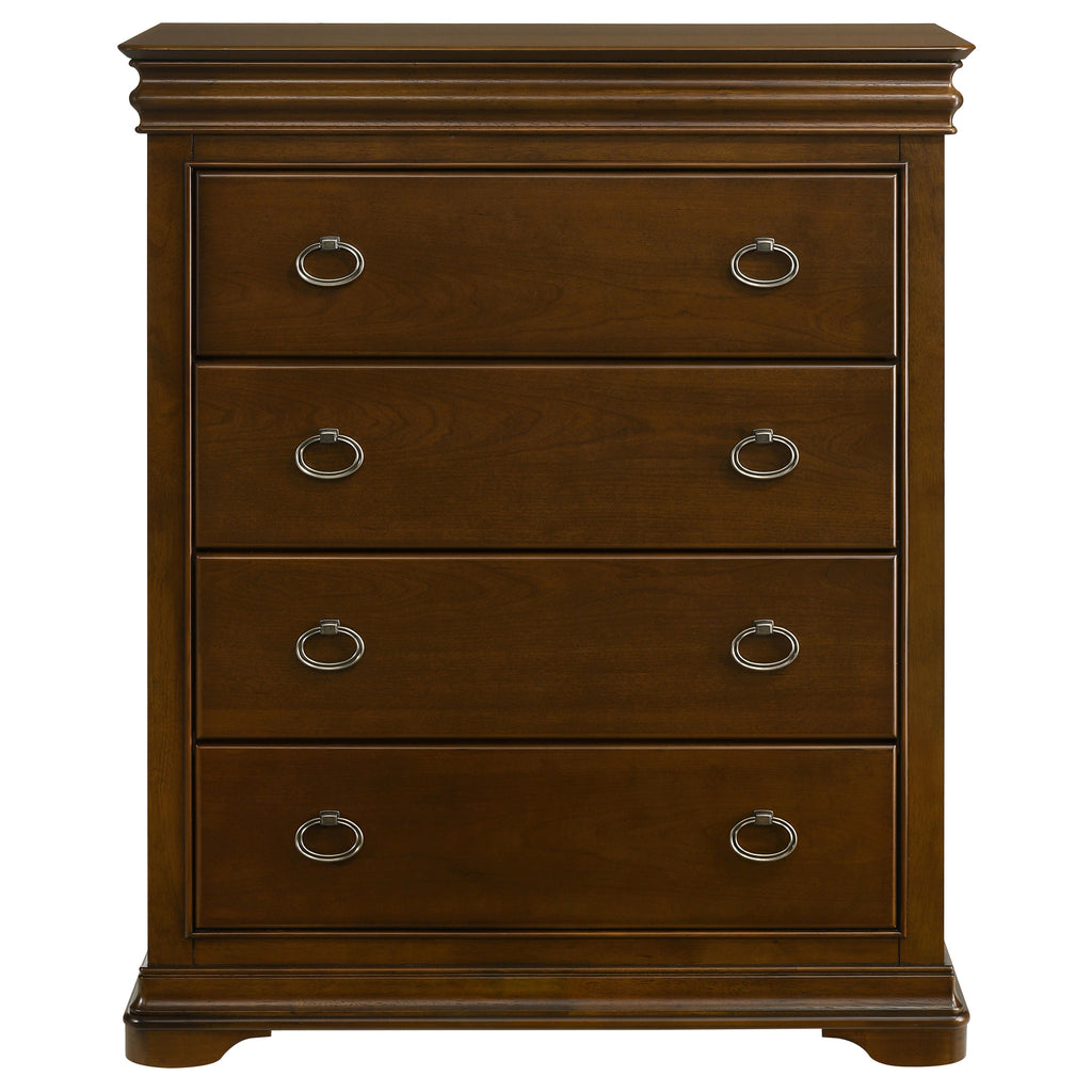 This four-drawer chest brings refined storage to traditional bedrooms with clean molding, antique nickel hardware, and a rich cherry finish. Felt-lined top drawers offer delicate protection, while cedar-lined bottom drawers help resist moisture and odor to preserve garments. With smooth gliding drawers and a stately silhouette, this chest delivers both classic appeal and long-lasting utility. Key Features: • Four-drawer chest with crown molding and stately silhouette for bedroom storage • Brown cherry finish pairs with antique nickel ring pulls for elegant contrast • Top drawer is felt-lined with tinted interior and English dovetail joinery • Cedar-lined bottom drawers protect clothing by repelling odor and moisture • Drawers glide on 45mm metal runners for smooth and reliable functionality • Constructed from solid rubberwood, engineered wood, cherry veneer, and plywood