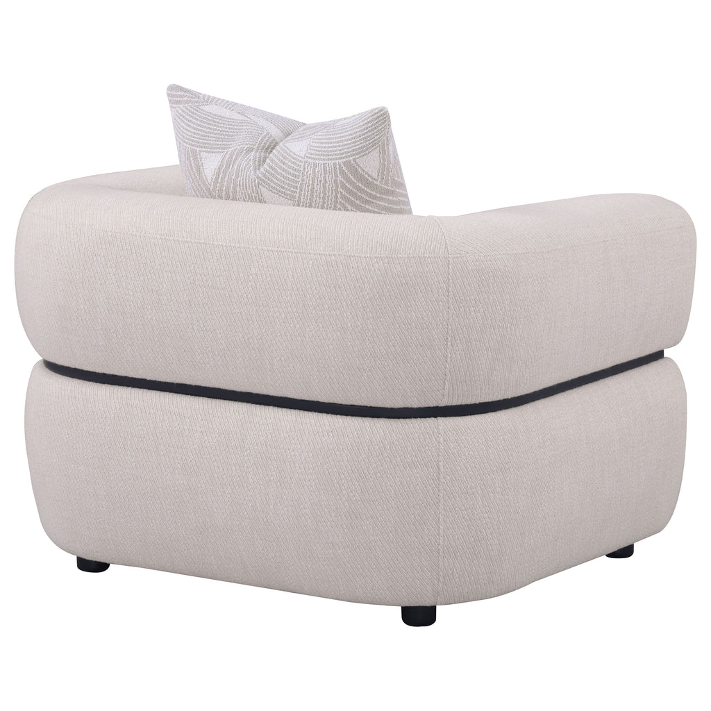 Sculptural in form yet grounded in comfort, this accent chair commands attention with its bold silhouette and plush detailing. Its wide, arched arms and thick waterfall seat are upholstered in textured fabric for a modern, tailored appeal. A distinctive solid wood waistband encircles the frame, while a down and pillow accents adds softness. With pocket coil support and refined shaping, it brings confident elegance to any living space. Key Features: • Generously scaled accent chair in beige finish with wide curved arms and sculptural silhouette • Textured fabric upholstery delivers plush softness and a modern tailored appearance • Thick waterfall bench seat features pocket coil construction for lasting support and comfort • Includes one loose accent pillow in a decorative down and feather blend for added luxury • Solid wood waistband detail elegantly wraps the exterior with sculptural refinement • Small dark brown bun feet subtly complement the profile and wood detailing above