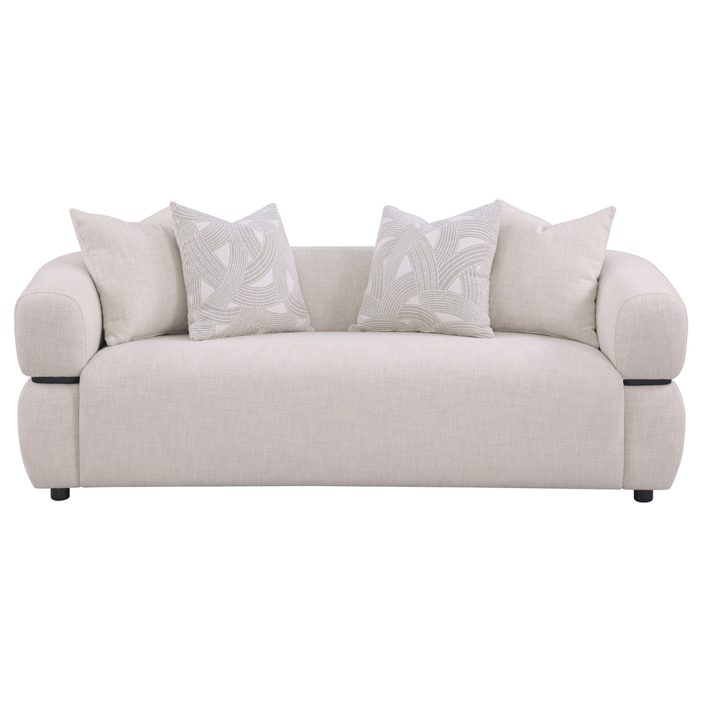 Sculptural and bold, this modern sofa pairs chunky contours with beautifully tailored detailing. Textured upholstery wraps a seamless waterfall bench seat, framed by a solid wood waistband that encircles the exterior. Pocket coil construction provides long-lasting support, while small bun feet complement the frame’s curvature. Down and feather blend accent pillows complete the look with softness and tonal contrast, making it ideal for eclectic interiors. Key Features: • Sofa with sculptural profile and tailored shaping offers a bold yet refined design • Beige fabric upholstery features textured softness and versatile modern appeal • Waterfall bench seat adds seamless flow with a well-kept tailored appearance • Solid wood waistband wraps the frame for structure and decorative elegance • Pocket coil seating delivers durable support and comfortable long-term use • Includes accent pillows for a designer-finished touch