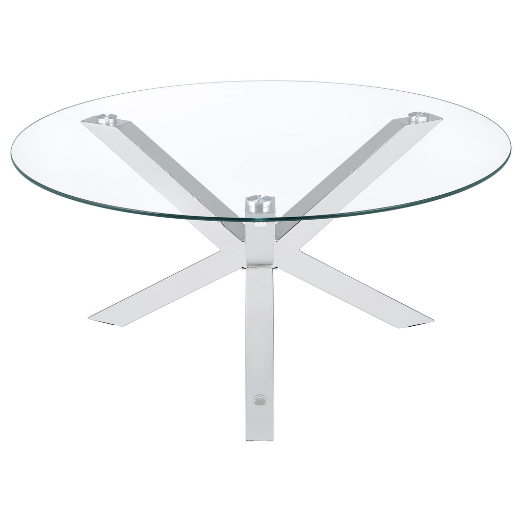 This modern center table fuses simplicity and sophistication, showcasing a tempered glass surface atop a striking, heavy gauge steel base with electroplated chrome and a polished finish. As a versatile cocktail table, accent table, or low table, it elevates any living room with a minimalist aesthetic. This coffee table provides a refined stage for décor, creating a contemporary focal point that complements a range of interior styles.
