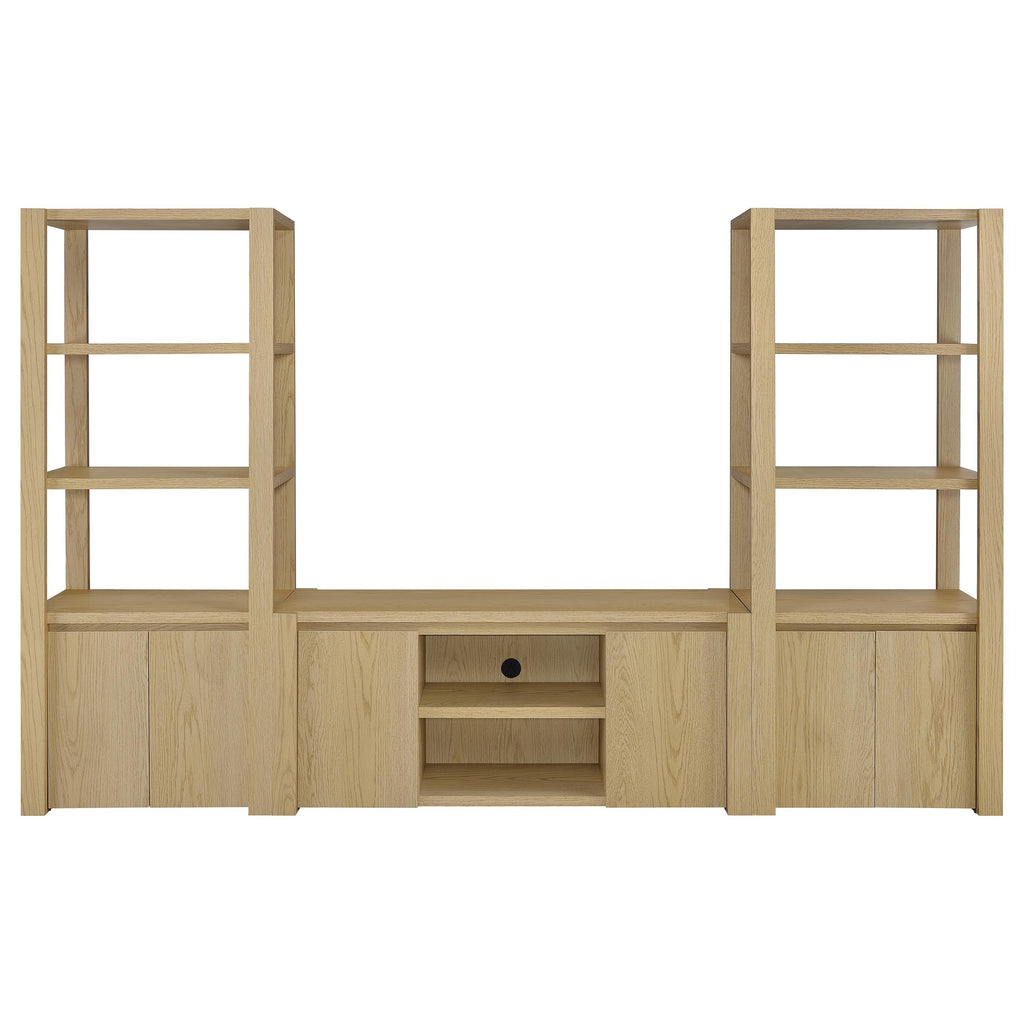 Graceful and grounded, this light oak entertainment center becomes the heart of your living space. A wide TV stand anchors the arrangement with open shelves and hidden storage, flanked by tall media towers that frame the scene with quiet elegance. Adjustable shelving and discreet cord cutouts offer flexibility without distraction. Crafted from engineered wood with a scratch-resistant and eco-friendly laminate veneer, it fits TVs up to sixty-five inches for a beautifully balanced display. Key Features: • Entertainment center with matching towers and TV stand in a warm light oak woodgrain finish • Light oak tone offers organic charm with clean symmetry and modern sophistication • 60-inch TV stand features open shelves and a two-door cabinet with adjustable interior shelf • Each media tower includes three open shelves and cabinet with one adjustable shelf • Rear cord cutouts offer seamless organization and accommodate up to 65 inch TVs • Crafted from engineered wood with a scratch-resistant and eco-friendly laminate veneer