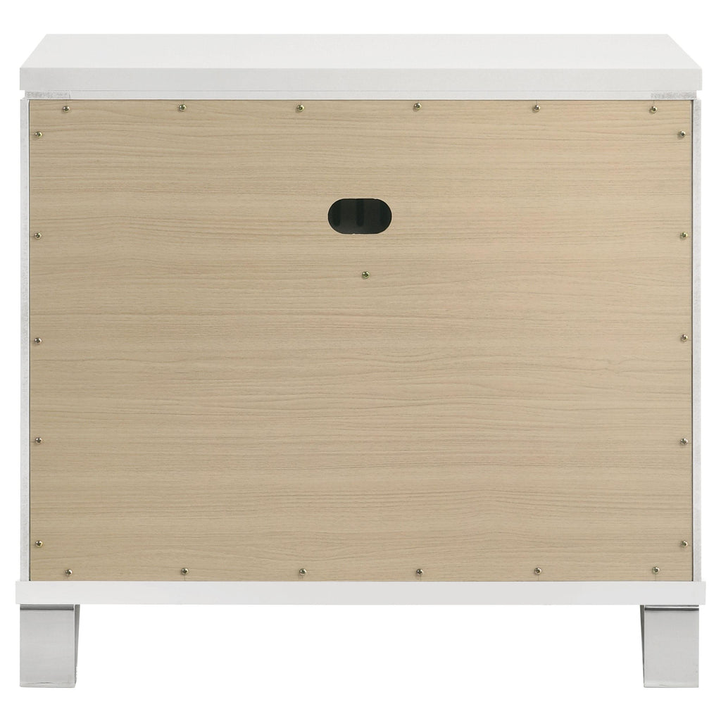 Complete your bedroom ensemble with this elegant 2-drawer nightstand, designed with a modern Italian aesthetic. The white finish, accented with mirror framing and polished chrome metal hardware, creates a striking look. Featuring picture framed recessed panels with an embossed herringbone graphic pattern, this nightstand offers both style and functionality. The top drawer includes cord management access, making it perfect for your rechargeable devices. Crafted from rubberwood, MDF, and mirror, this nightstand is a luxurious addition to any bedroom. Key Features: • 2-Drawer modern Italian design with a striking white finish • Picture framed recessed panels with embossed herringbone graphic patterns • Mirror framing and polished chrome metal hardware • Top drawer includes cord management access • Crafted from rubberwood, MDF, and mirror