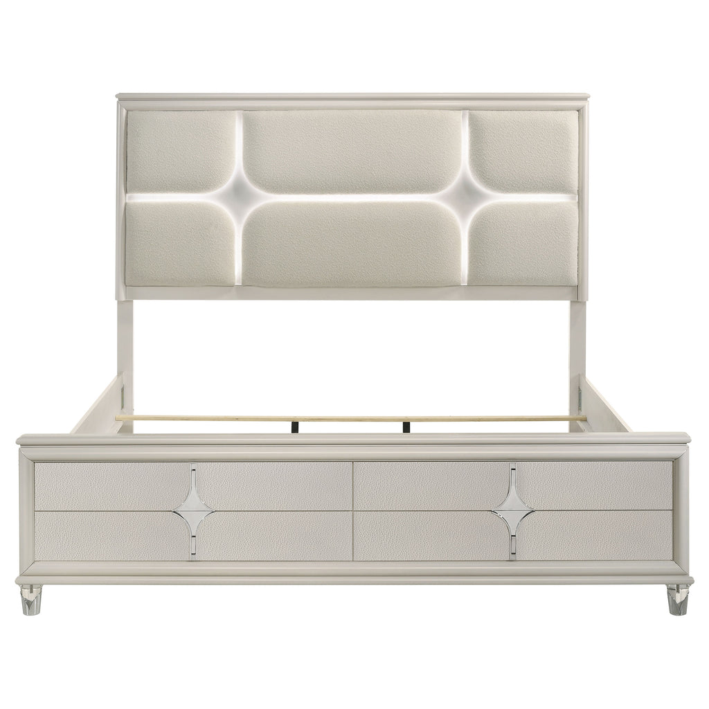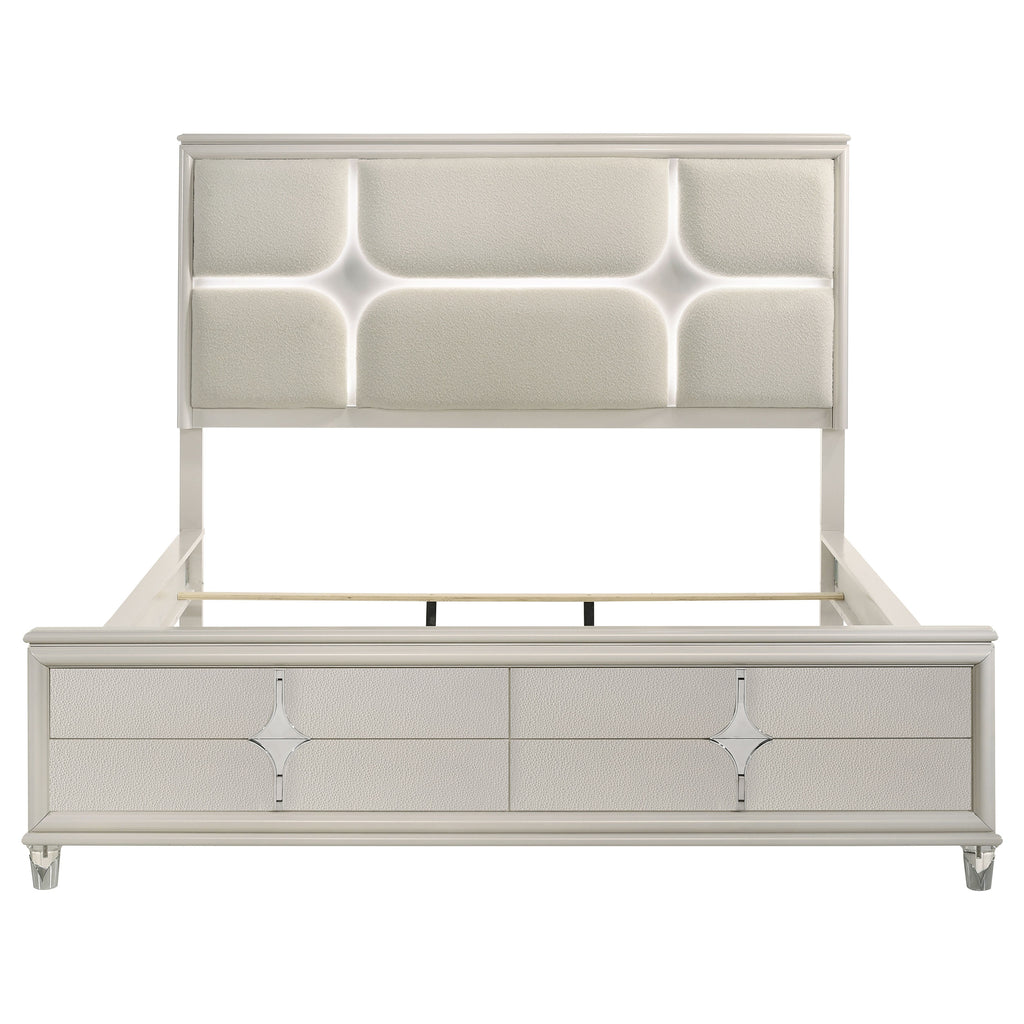 Transform your bedroom into a sanctuary of modern elegance with this luxurious bed. The striking headboard, adorned with ivory boucle upholstery and 3D star-shaped channel lighting, creates a captivating focal point. Touch LED lights add a warm, inviting glow, perfect for winding down in the evening. Designed with sleek lines and a diamond star motif on the footboard, this bed exudes contemporary sophistication. Available in queen, eastern king, and California king sizes, it promises to be the centerpiece of your dream bedroom.