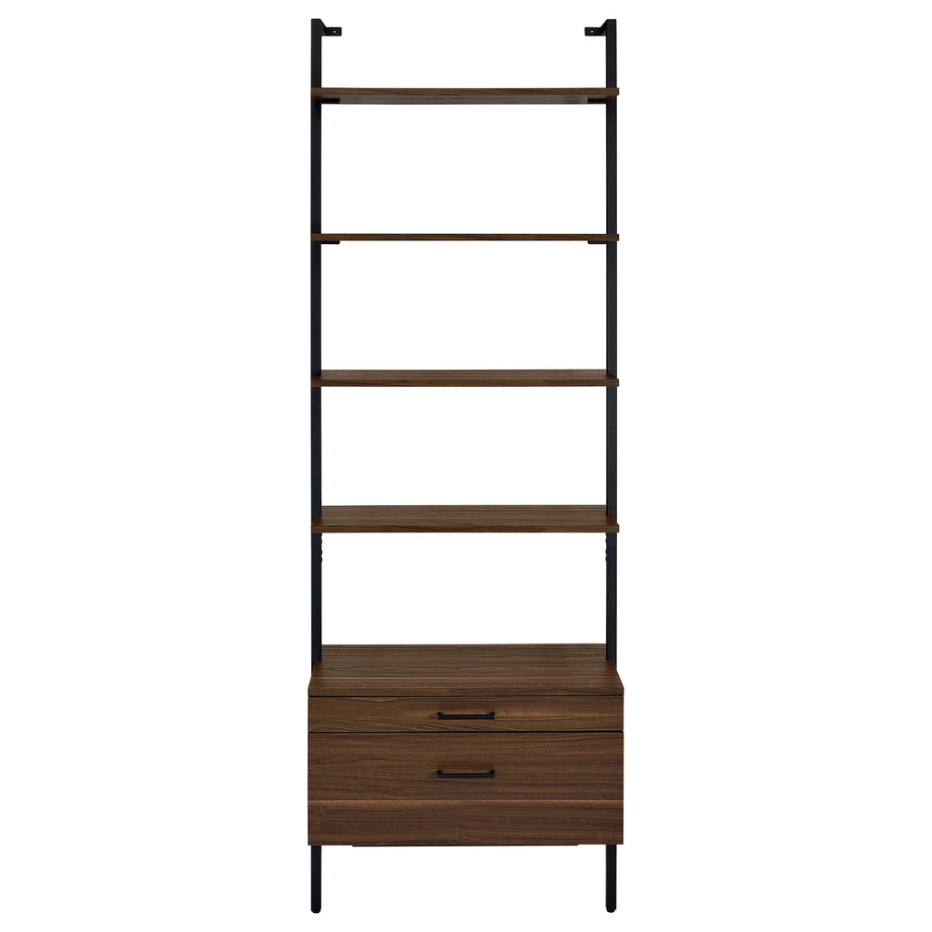 Play up the light, airy ambiance of a modern space while making use of every inch with a modern wall bookcase. It features four floating upper shelves and a lower case with two drawers, perfect for a blend of storage and display in any room. The shelves and two drawers feature a warm walnut finish over melamine paper, offering durability for a lovely look that lasts. A black finish metal frame supports the bookcase, offering neutral appeal in any setting. Stash essentials in the drawers while adding decor to shelves for a personal look and feel.