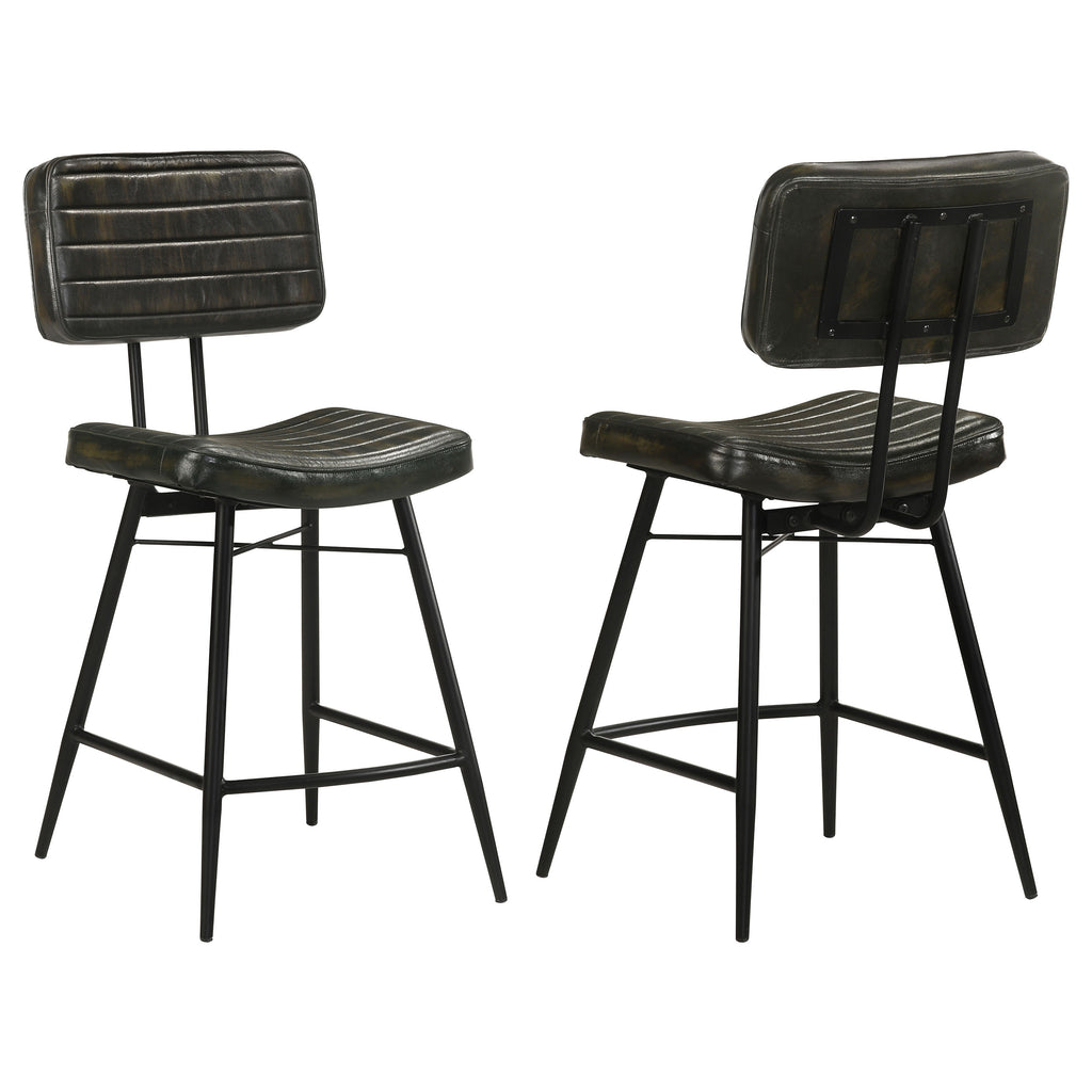 Bring a refined retro presence to your space with this genuine leather counter height chair set. Upholstered in hand-dyed leather for a soft, lived-in feel, each stool showcases a contoured seat and supportive backrest with channel tufting and welt trim. The black iron frame features flared tapered legs and a built-in footrest for stability and comfort. A bold X-brace accent at the back adds visual contrast and industrial flair. Perfect for kitchens, bars, or gathering spaces, this set blends vintage design with everyday durability. Key Features: • Counter chair set blends vintage character with modern durability • Wrapped in genuine leather upholstery with an antique camel tone • Channel tufting and welt trim add rich dimension and tactile appeal • Iron X-brace backrest provides strength and visual contrast • Sturdy black iron frame with footrest ensures lasting stability • Set of two counter height chairs ideal for kitchens or bar areas