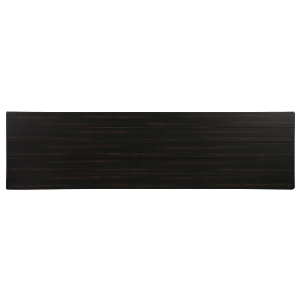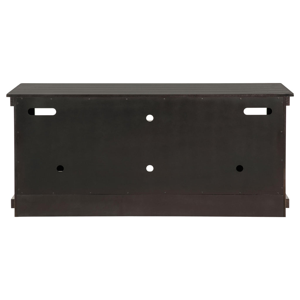 Complete a media center in your inviting home with a modern farmhouse TV stand. It's an approachable design with roughhewn wood details that create texture and dimensionality in your living space. Two shelves and six compartments create ample storage, perfect for everything from peripherals and accessories to personal decor. The media console features a clean-lined silhouette with a slim profile, perfect for a flat panel or wall-mounted television. This TV stand accommodates televisions up to 65 inches. Key Features: • Roughhewn wood markings add artisan character to a modern farmhouse TV stand • A distressed finish lends casual farmhouse character in your den or living room • Two open shelves provide space for media and gaming peripherals and decor • Six compartments storage that's perfect for accessories and media like games and controllers • A slim, straight-lined silhouette supports a flat panel television up to 65 inches