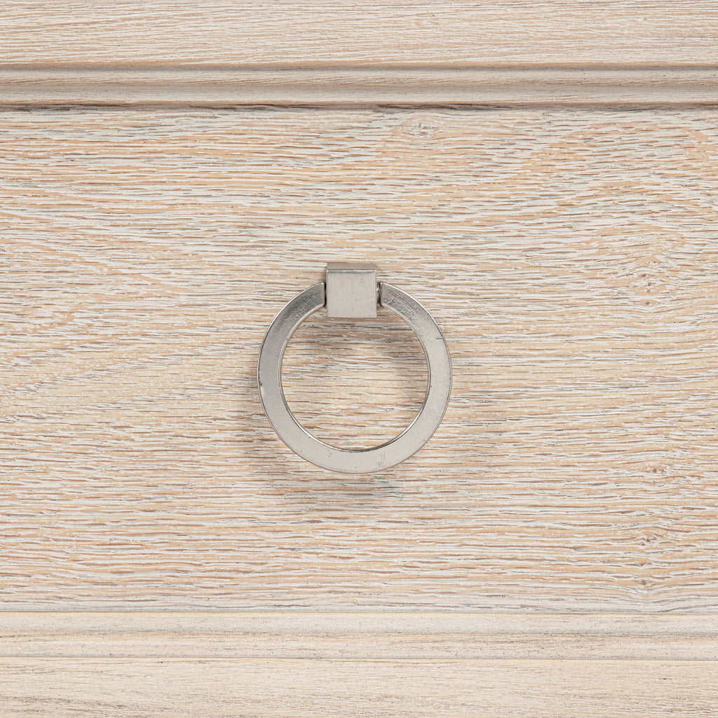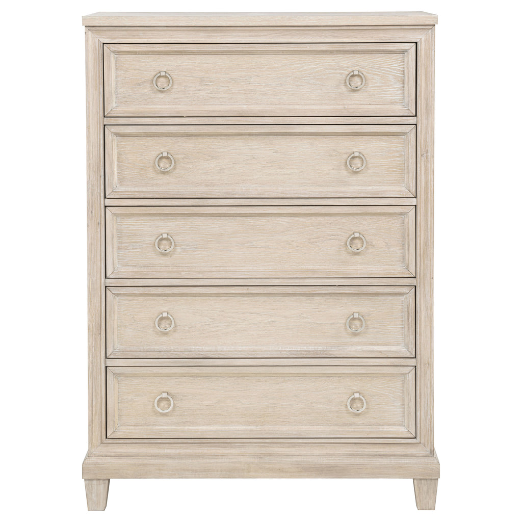 Rooted in timeless grace, this five-drawer chest evokes the quiet elegance of a well-appointed retreat. Gently stepped trim and soft ring-pull hardware lend a sense of heritage, while the washed oak finish whispers of sun worn wood and airy calm. With generous storage hidden behind its refined facade, this piece offers both beauty and intention—crafted to hold life’s essentials while elevating the rhythm of everyday living. Key Features: • Five-drawer chest with stepped trim and clean lines for classic bedroom appeal • Washed oak finish reveals organic grain with a light, airy character • Spacious drawers offer practical storage for clothing and linens • Ring-pull hardware adds traditional charm with a subtle metallic accent • Crafted from poplar, engineered wood, and oak veneer for lasting strength • Tip-over restraint included for added safety and everyday stability