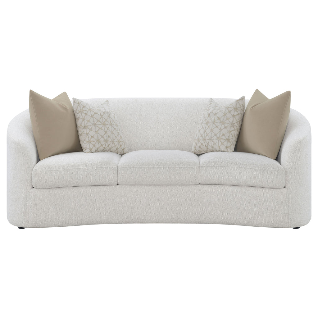 Bring inviting sophistication to your space with this contemporary curved sofa, featuring a soft latte boucle fabric that highlights its smooth contours. The sloped armrests and tight back lend an elegant silhouette, while plush seat cushions ensure lasting comfort. Coordinating accent pillows filled with premium faux down add an extra touch of luxury. With its clean lines and textural appeal, this sofa becomes a refined centerpiece that blends warmth, modern style, and timeless comfort._x005F_x000D_ Key Features: • Curved sofa wrapped in soft latte boucle upholstery for modern texture • Sloped armrests and rounded edges create a smooth sculptural profile • Three plush seat cushions offer supportive and lasting comfort • Tight back design maintains a tailored and refined appearance • Accent pillows with faux down fill complete its cozy, upscale look • Perfect for living rooms seeking contemporary elegance and warmth