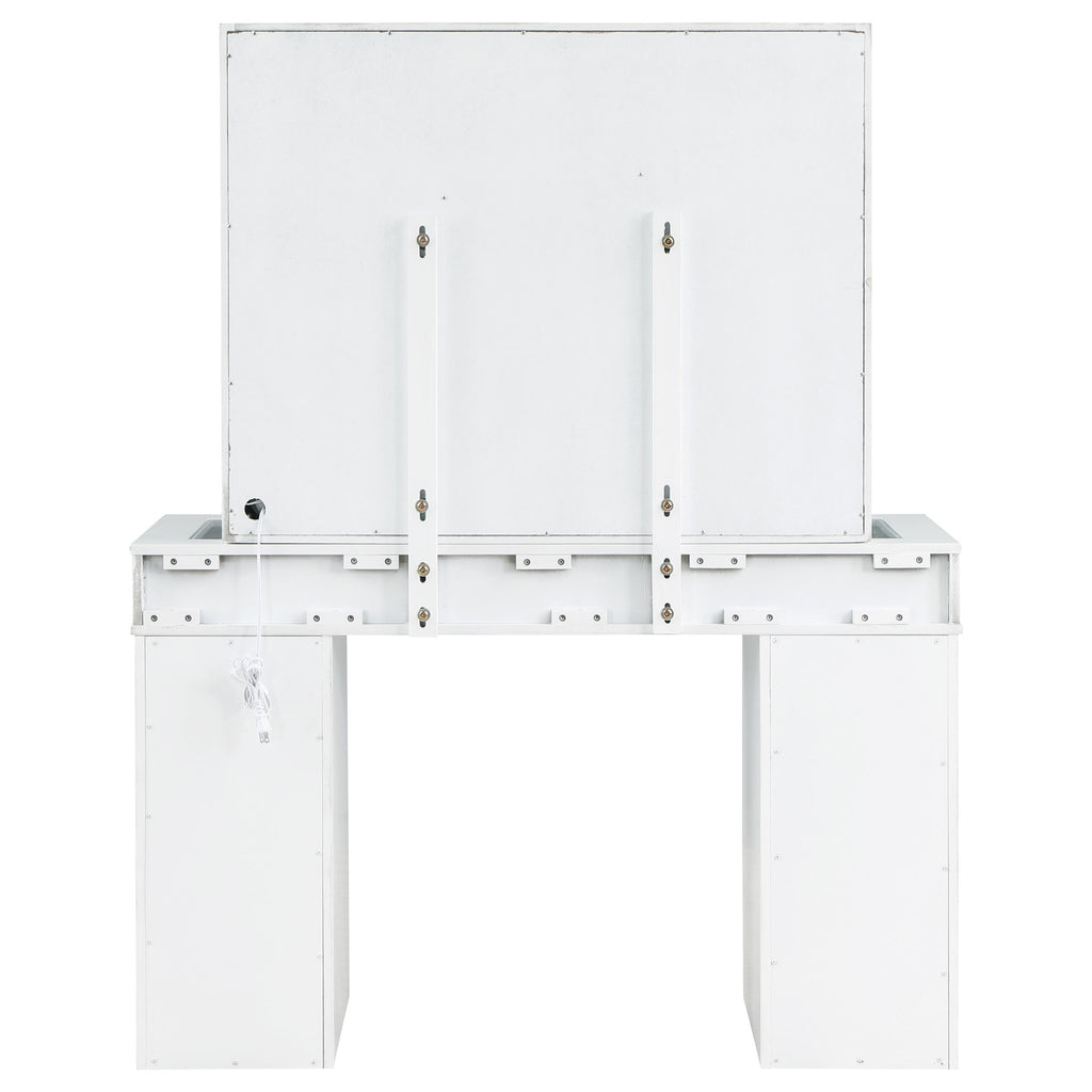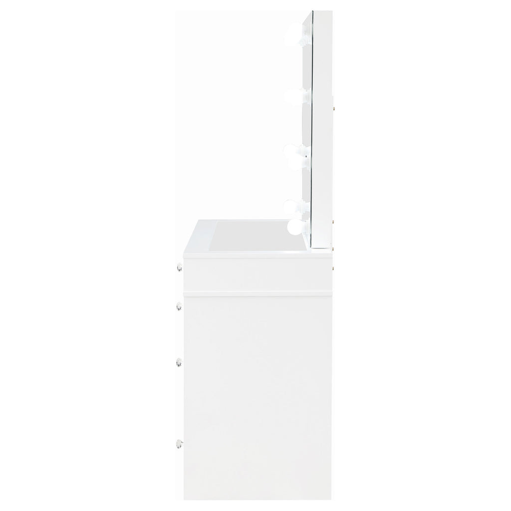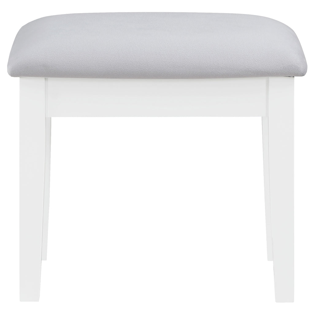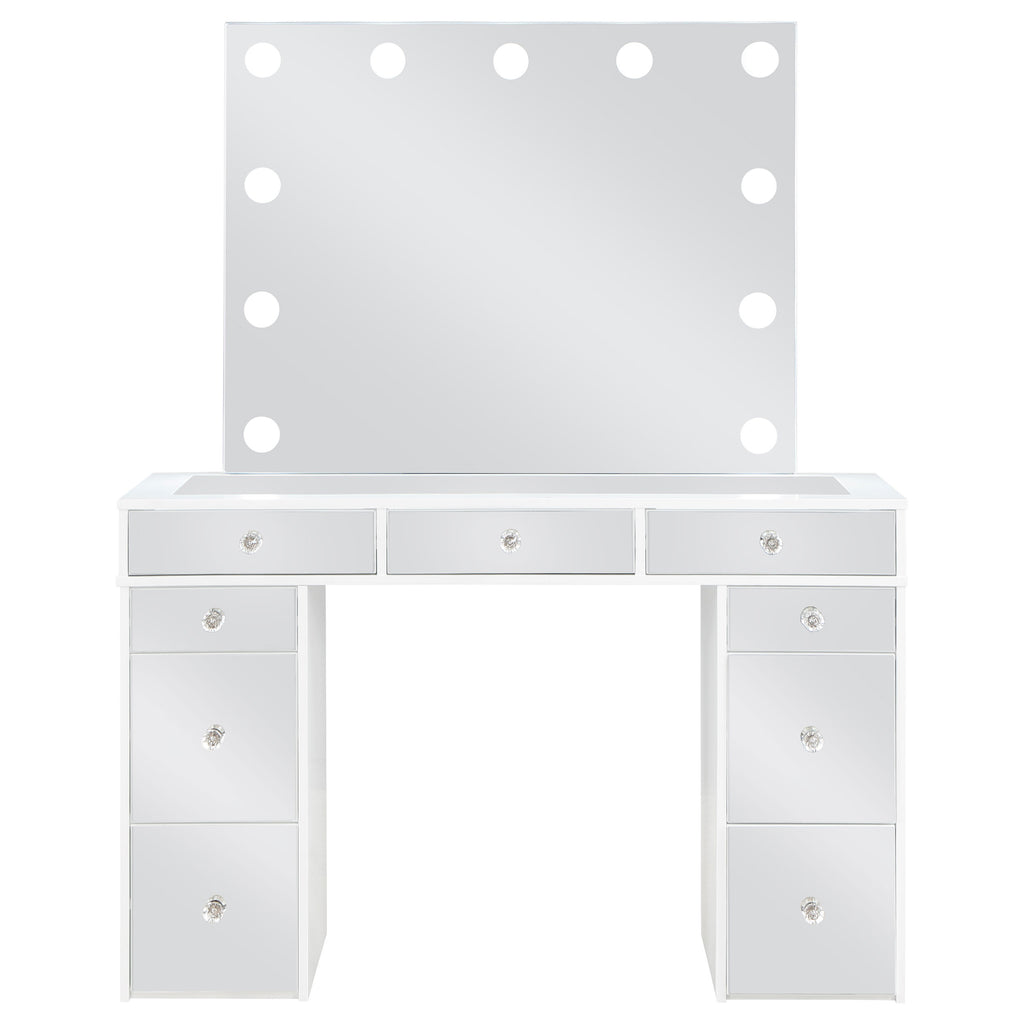 Pull out all the stops to set up a stylish and functional space for your makeup and prep, adding this three-piece white finish vanity set to a modern bedroom. Wood products construction with mirrored drawer fronts and a gray upholstered stool cushion team up to maintain an easy palette with versatility. Find space in nine drawers to stash implements, cosmetics, and accessories. Charming crystal knobs and a felt-lined top drawer add to a list of fab features. The marquee element of this set is a mirror surrounded with bulbs to offer helpful lighting as it enhances a chic design. Key Features: • Three-piece white finish vanity set, perfect for a modern bedroom setup • Constructed from wood products, featuring mirrored drawer fronts for a sleek look • Comes with a gray upholstered stool cushion, providing comfort and style • Offers ample storage with nine drawers, including a felt-lined top drawer, all adorned with charming crystal knobs • Includes a mirror surrounded by bulbs, providing helpful lighting and enhancing the chic design