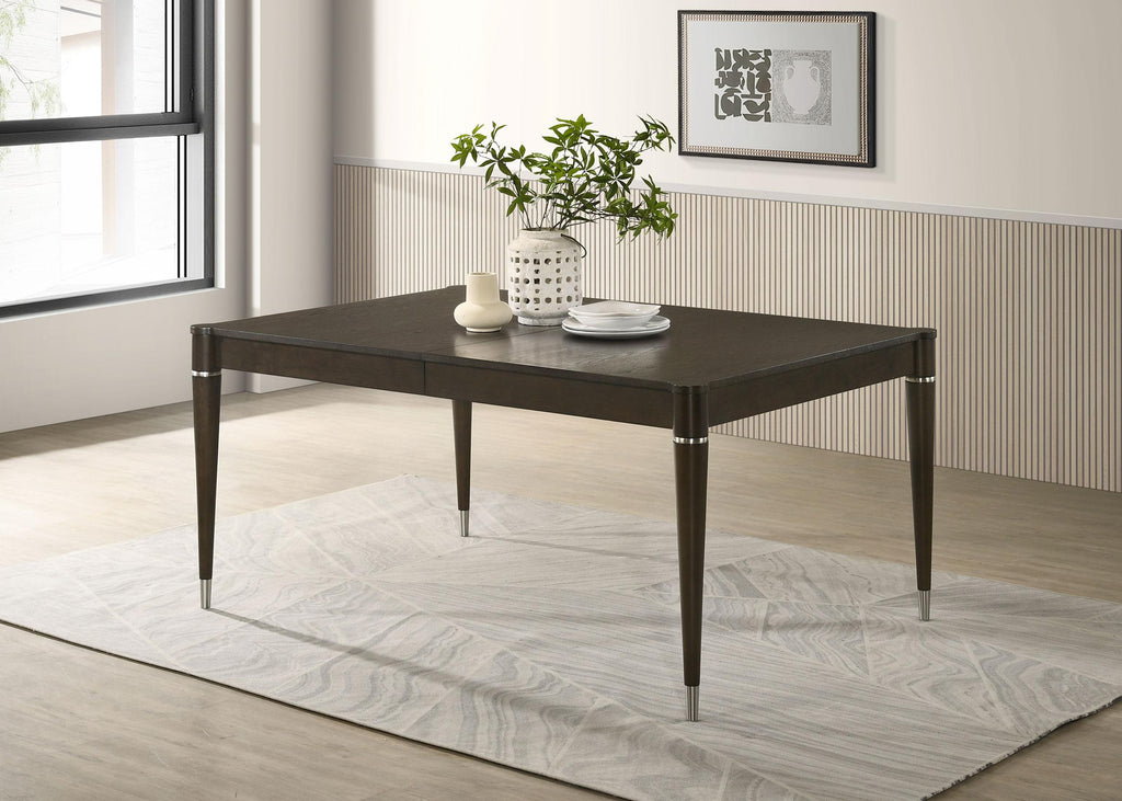 Enhance your dining experience with this contemporary dining table in a stunning ash brown finish. Crafted with a combination of engineered wood, Asian hardwood, and ash veneer, it delivers durability and timeless elegance. The table extends from 63 inches to 81 inches with a removable extension leaf, offering flexibility for intimate dinners or larger gatherings. Metal-capped tapered legs and subtle metallic accents elevate the design with a modern touch. Perfectly suited for any dining setting, this table blends functionality with stylish appeal.