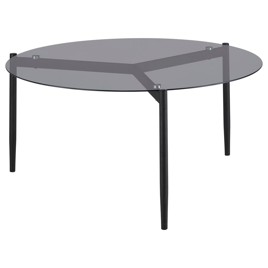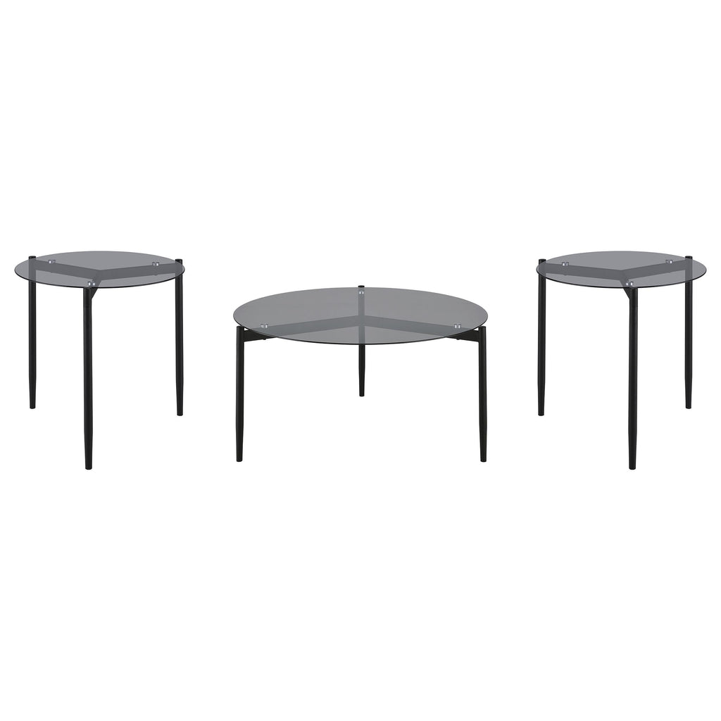 This modern coffee table set includes a sleek coffee table and matching side table, both featuring tempered smoked glass tops for lasting durability and style. Supported by sturdy black powder-coated metal bases with a sandy texture, the set exudes contemporary elegance. The minimalist round designs ensure versatile functionality and seamless integration into any living space. Perfect for creating a cohesive and modern focal point.