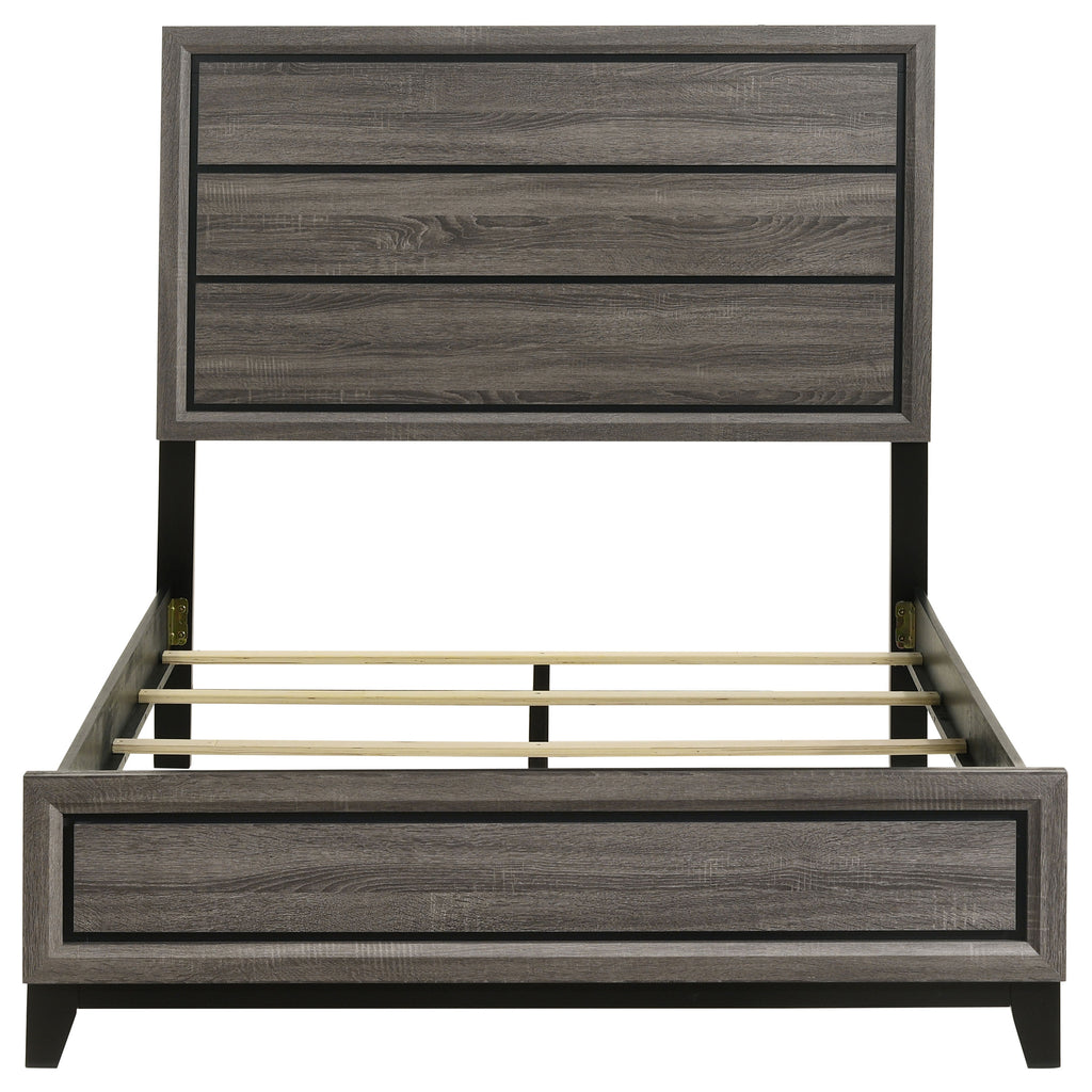 This modern panel bed combines sleek form and transitional appeal to create a timeless centerpiece for any bedroom. Crafted from durable engineered wood, it features a two-tone grey oak and black finish that adds depth and contrast. The framed headboard and matching footboard showcase recessed horizontal grooves for subtle texture and visual interest. Supported by solid hardwood legs, this bed blends durability with contemporary sophistication and pairs effortlessly with a variety of bedroom furnishings. Key Features: • Transitional panel bed crafted with engineered wood for lasting support • Grey oak finish pairs with sleek black framing for modern contrast • Recessed grooves on headboard and footboard add depth and texture • Framed design creates a clean, dimensional silhouette • Black solid hardwood legs provide stability and timeless appeal • Foundation required; complements both casual and refined spaces