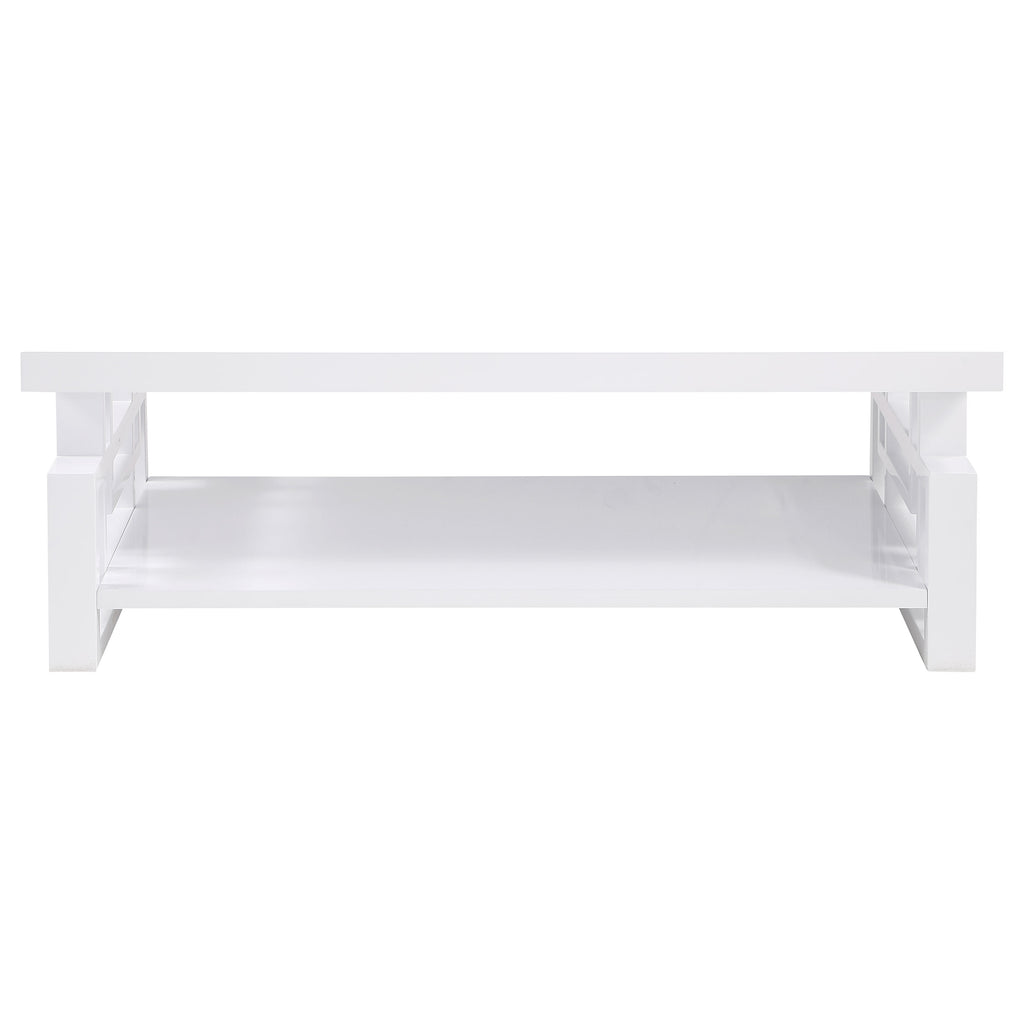 This modern coffee table set, featuring a cocktail table and a side table, blends sleek style with practical functionality. Crafted from engineered wood, both pieces showcase a striking white high-gloss finish for a polished and contemporary look. The geometric leg design adds a bold architectural flair, while open lower shelves offer practical storage. Perfect as a coffee table or end table combination, this set elevates any living room with modern sophistication.