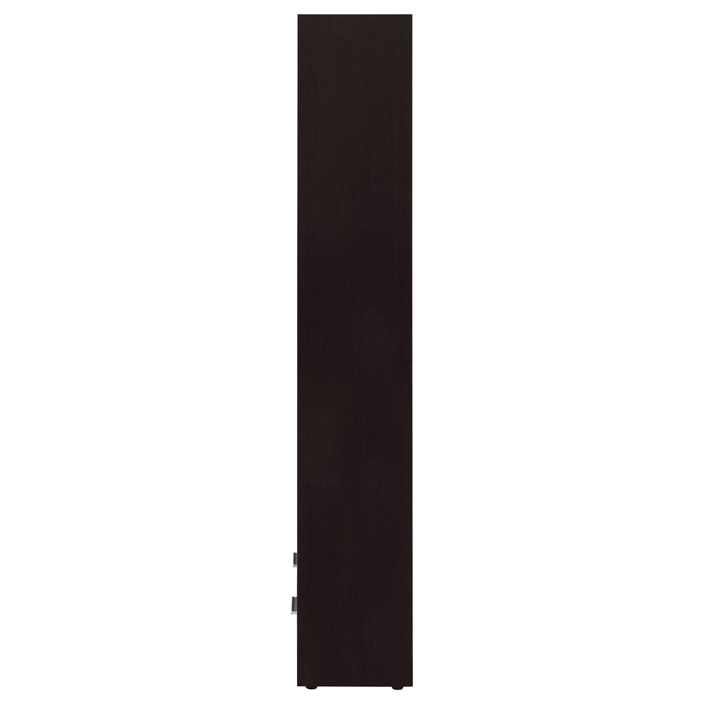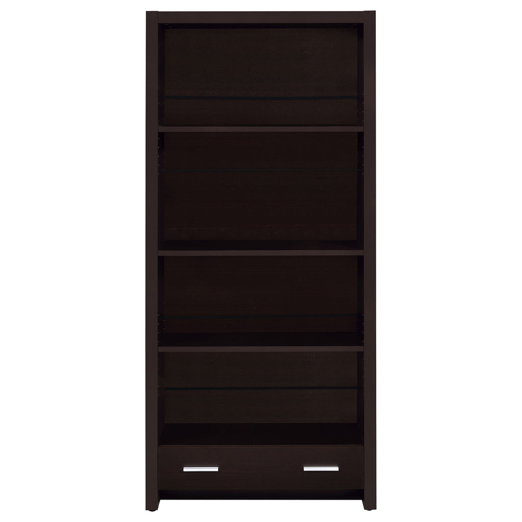 Enhance your office or living space with this modern bookcase, offering both open shelving and concealed storage. The rich cappuccino finish brings a warm and sophisticated touch, while four spacious shelves provide ample room for books, décor, and office essentials. Two adjustable shelves allow for customizable organization, while a lower drawer with sleek silver handles offers discreet storage. Built from durable engineered wood and laminate veneer, this bookcase is a stylish and practical addition to any workspace or home library. Key Features: • Modern bookcase with a sleek cappuccino finish for a refined look • Four spacious shelves, including two adjustable for flexible storage • Lower drawer with smooth Euro glides provides concealed storage • Durable MDF, engineered wood, and laminate veneer construction • Perfect for home offices, living rooms, or study areas • Pairs beautifully with matching office furniture for a cohesive setup