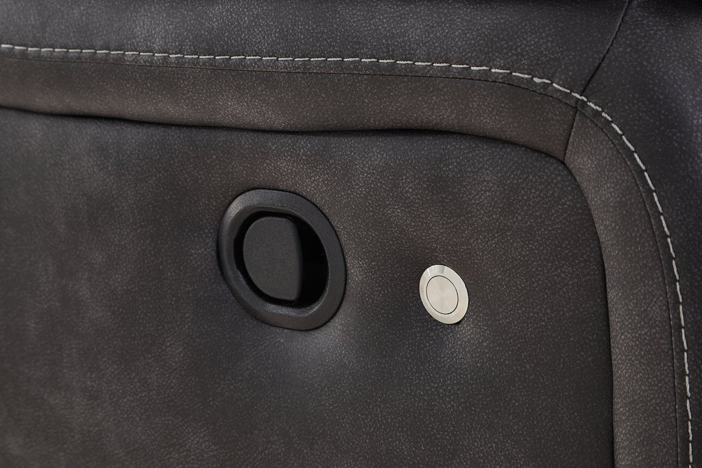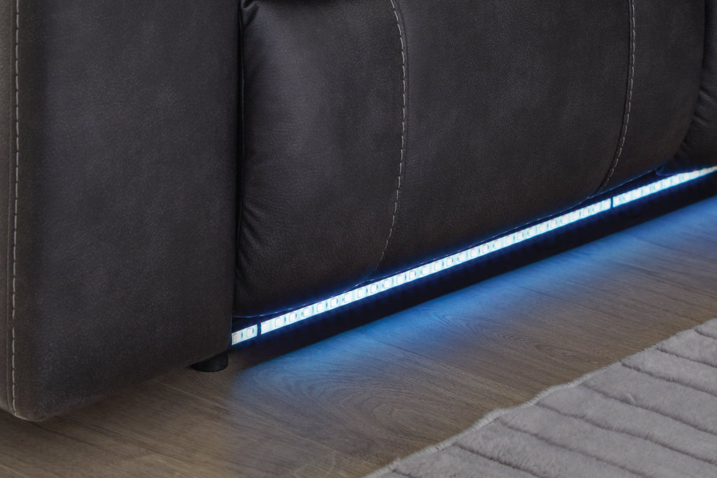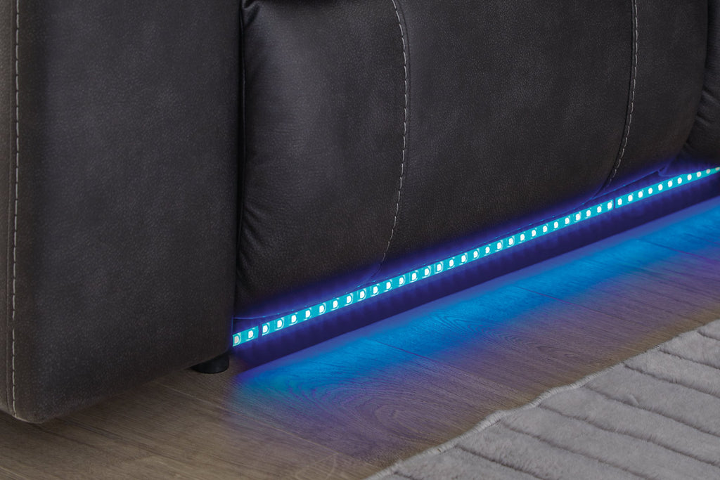 This reclining sectional pairs the luxe look of faux leather with must-have functional features. LED lights on the underside put a modern twist on the simply chic design—choose from three colors to add ambiance to movie night or gaming with friends. And you can keep remotes, drinks and other entertainment essentials close with the handy console. Ready to relax? Easy pull tab reclining has you stretched out in no time.